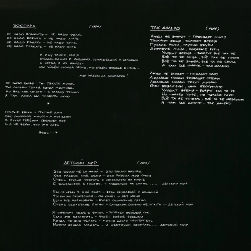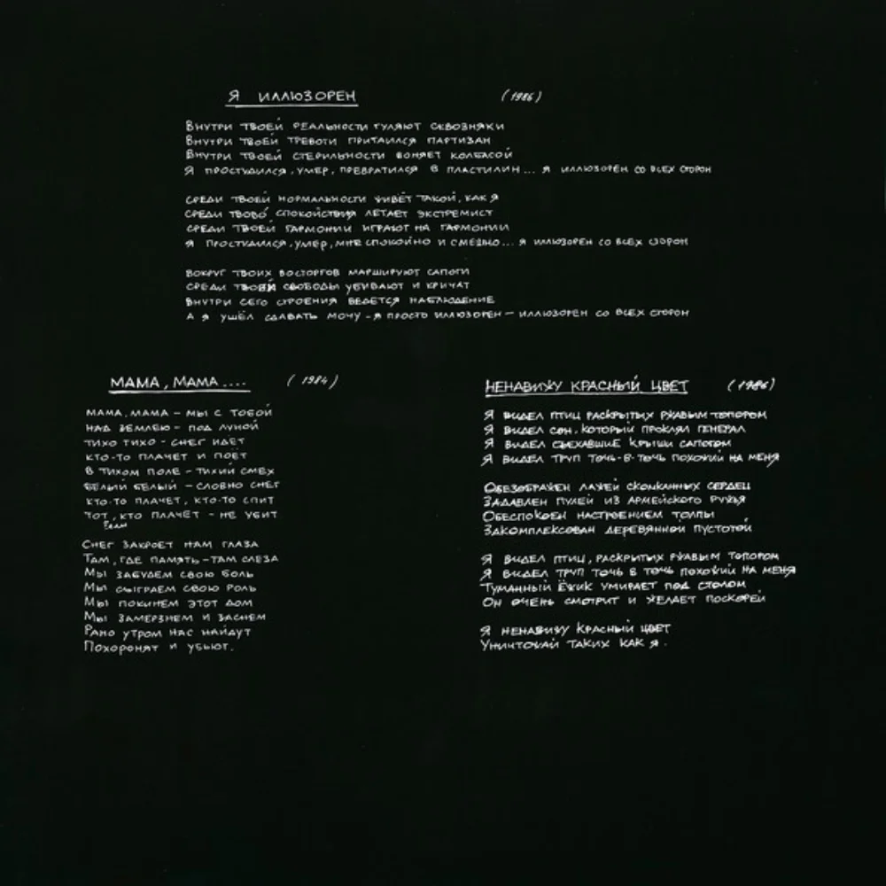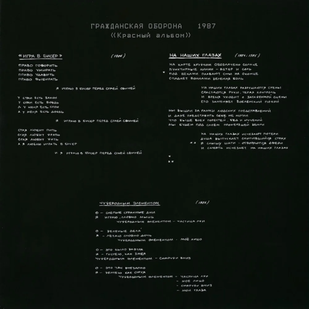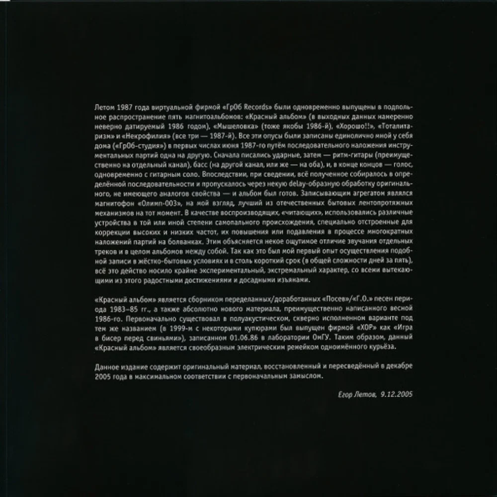 Это издание представляет собой уникальный культурный артефакт эпохи, когда музыка была не только звуком, но и мощным выражением протеста, внутреннего мира и социальных наблюдений. Записанный в легендарной ГрОб-студии в период с конца мая по начало июня 1987 года, альбом полностью отражает творческую энергию Егора Летова, который выступил здесь не только как продюсер, но и как единственный исполнитель: он исполнил вокал, гитарные партии, бас и ударные, а также написал все тексты.