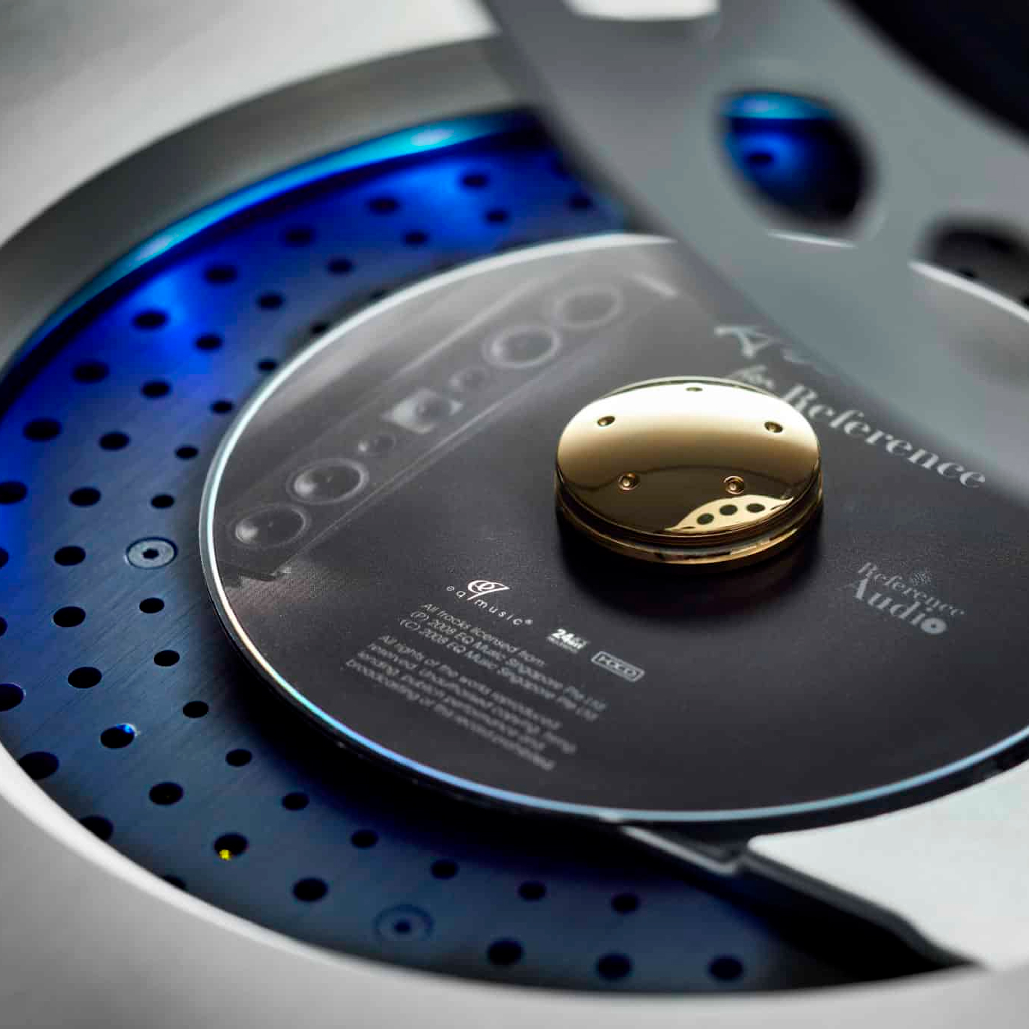 Необычный треугольный корпус Gryphon Ethos: комбинация из алюминия и акрила с синей подсветкой приемника дисков притягивает и манит взор. Массивный (13.7 кг) компонент покоится на трех регулируемых опорах Gryphon Atlas, выполненных из полиоксиметилена, алюминия и закаленной стали – фирменного материала (компания называет его «механический диод», отводящий нежелательную энергию только в одном направлении), гарантирующего отличную виброразвязку от любой поверхности.