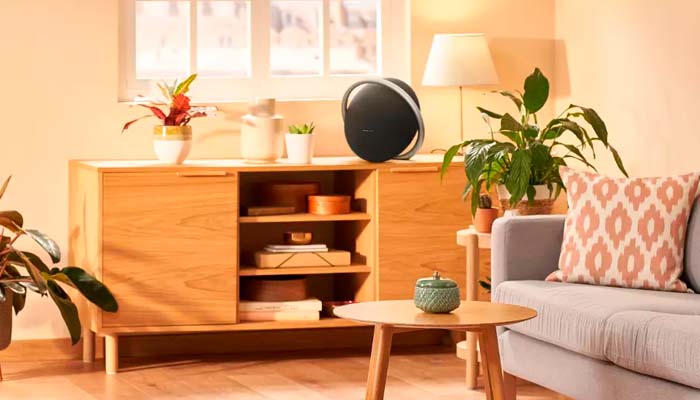 Круглый корпус колонки словно парит в воздухе. И смотреть на Harman Kardon Onyx Studio 8 также приятно, как и трогать: она отделана премиальной акустической тканью. Вверху колонки расположились удобные кнопки, идеально вписавшиеся в общую концепцию: включатель, сопряжение Bluetooth, регулировка громкости. А на тыльной стороне можно обнаружить порт AUX для подключения других источников звука, вход питания и USB-C. Кроме того, вы можете объединить два экземпляра в пару, для стереозвучания по технологии Wireless Dual Sound. Под решеткой два 1-дюймовых твитера и один 4,8-дюймовый вуфер в сумме дают 50 Вт и обеспечивают частотный диапазон от 50 Гц до 20 кГц.
