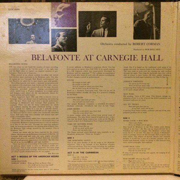 Треклист A1 Introduction Darlin' Cora A2 Sylvie A3 Cotton Fields A4 John Henry A5 Take My Mother Home B1 The Marching Saints B2 Day O B3 Jamaica Farewell B4 Man Piaba B5 All My Trials C1 Mama Look A Boo Boo C2 Come Back Liza C3 Man Smart (Woman Smarter) C4 Hava Nageela C5 Danny Boy C6 Merci Bon Dieu (From The "Haitian Suite") D1 Cu Cu Ru Cu Cu Paloma D2 Shenandoah D3 Matilda Особенности Лейбл: RCA Victor Страна: USA Формат: LP Количество треков: 19 Звучание: Stereo
