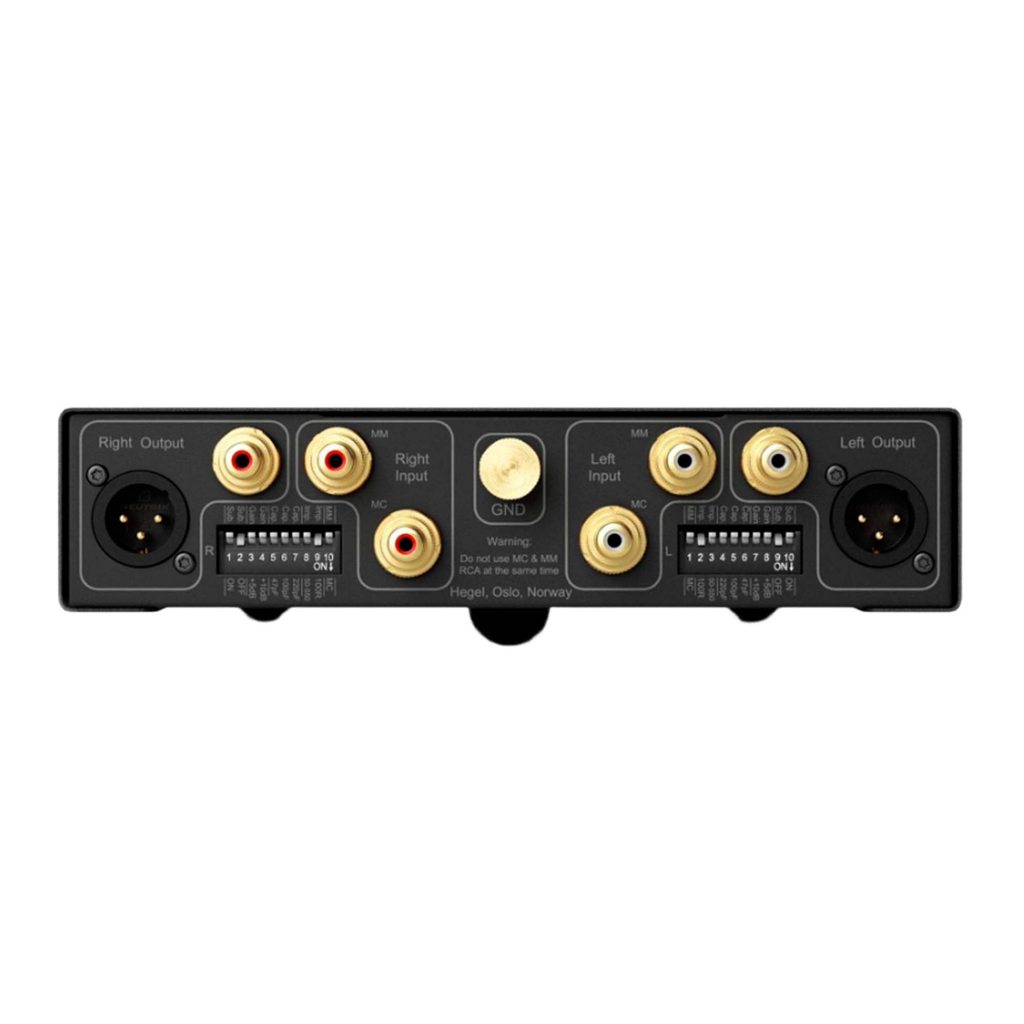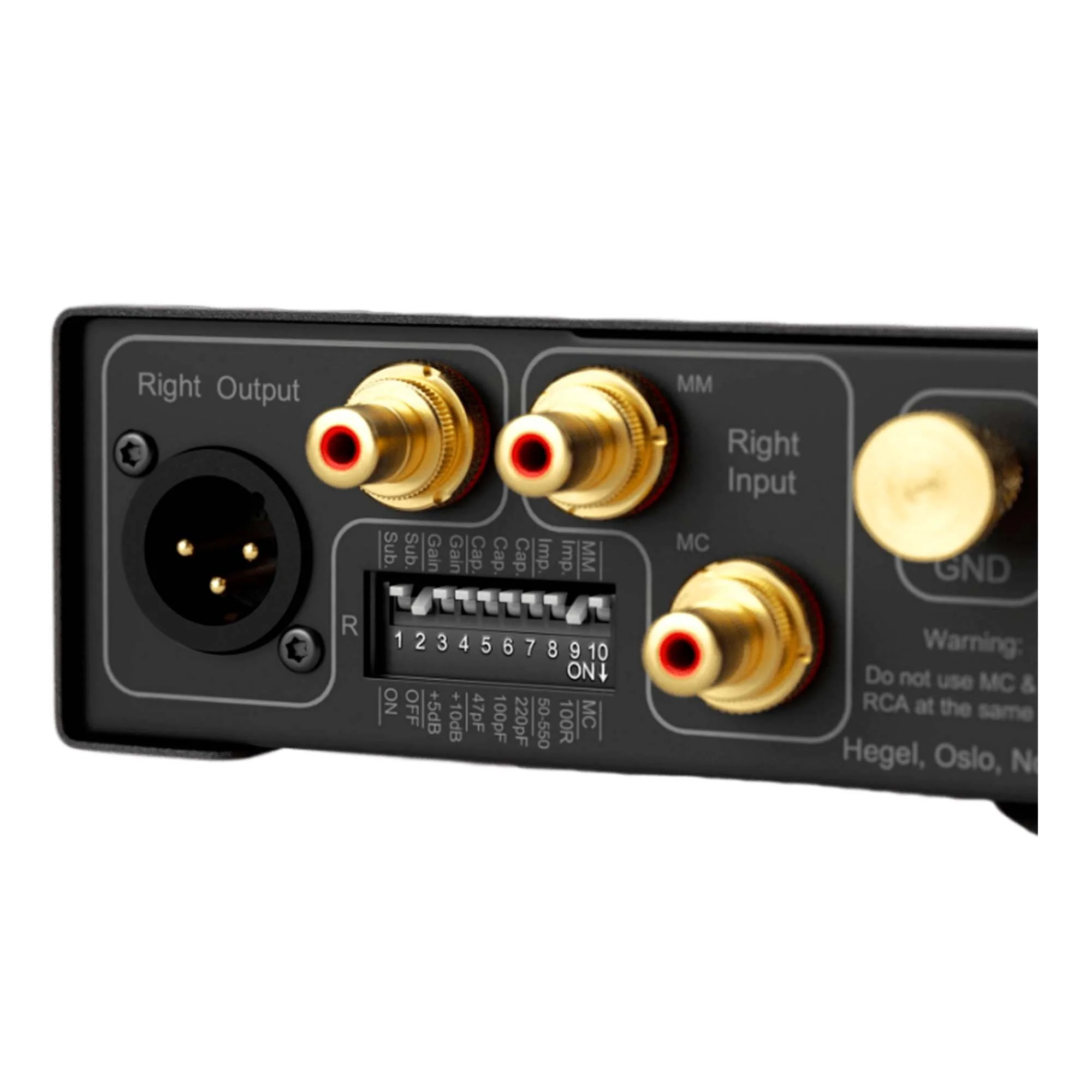 На задней панели устройства находятся RCA-входы для MM и MC-звукоснимателей, а также балансные и небалансные выходы. Контакты всех разъемов позолочены для сохранения стабильного соединения в течение длительного времени. Около разъемов каждого канала находятся микропереключатели для настройки входных параметров, а также изменения коэффициента усиления. Это позволяет оптимально настроить Hegel V10 для работы с разными моделями картриджей. Аудиосхема фонокорректора построена на малошумящих полевых JFET-транзисторах, при этом на входе для MC-картриджа используется по четыре таких транзистора в каждом канале, включенных параллельно. Это полностью исключило протекание тока через катушки звукоснимателя и устранило фоновые шумы.