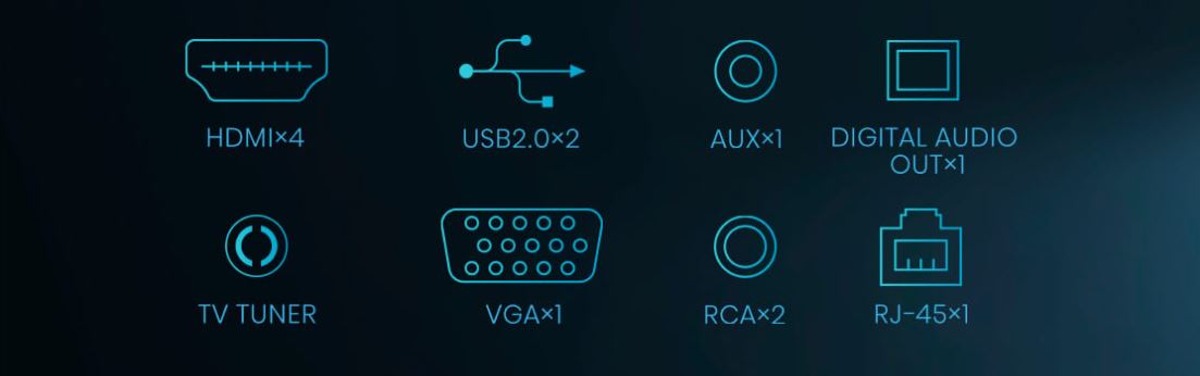 - интерфейсы: 4 х HDMI, 2 х USB 2.0, AUX X1, цифровой аудио выход, 1 х VGA, поддержка Ethernet, 2 х антенных входа;