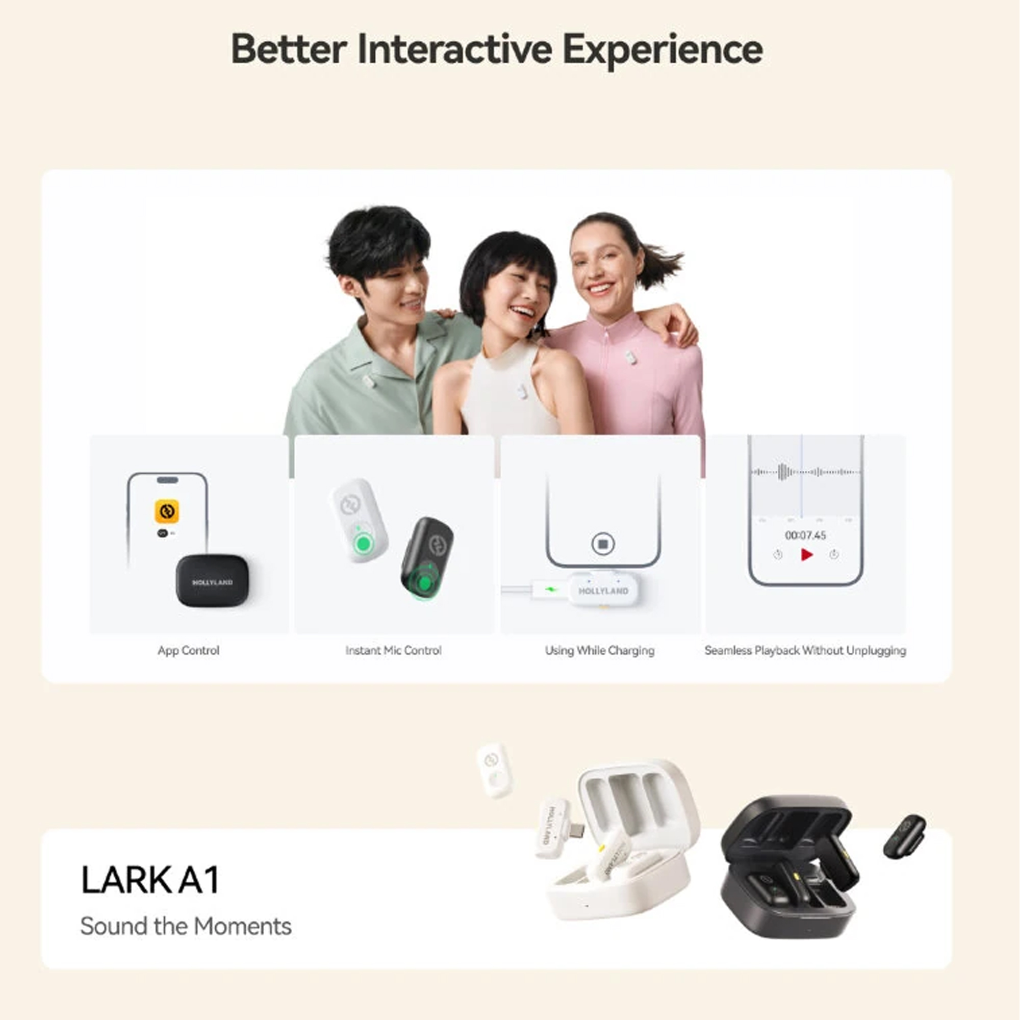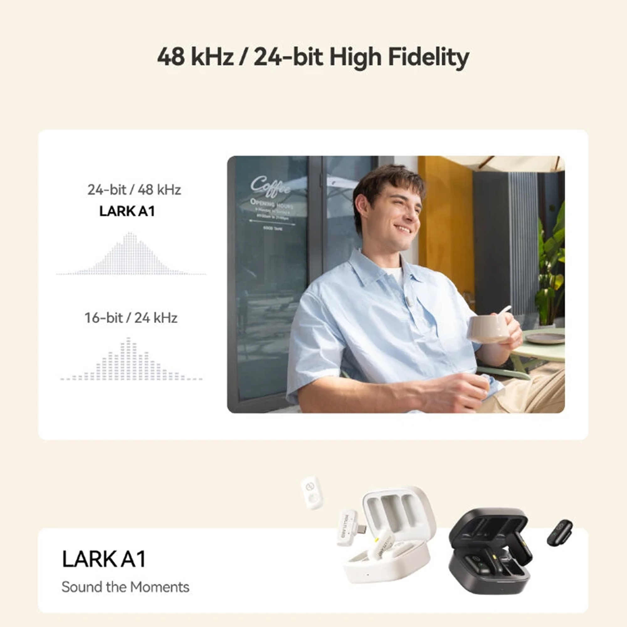 С компактным кейсом-зарядкой система обеспечивает до 54 часов работы — даже при активном шумоподавлении передатчики работают 6.5 часов, а их подзарядка занимает менее часа. Функция «двойной зарядки» позволяет одновременно питать смартфон через сертифицированный Apple MFi порт приёмника, превращая Lark A1 в универсальный хаб для стримов и подкастов.