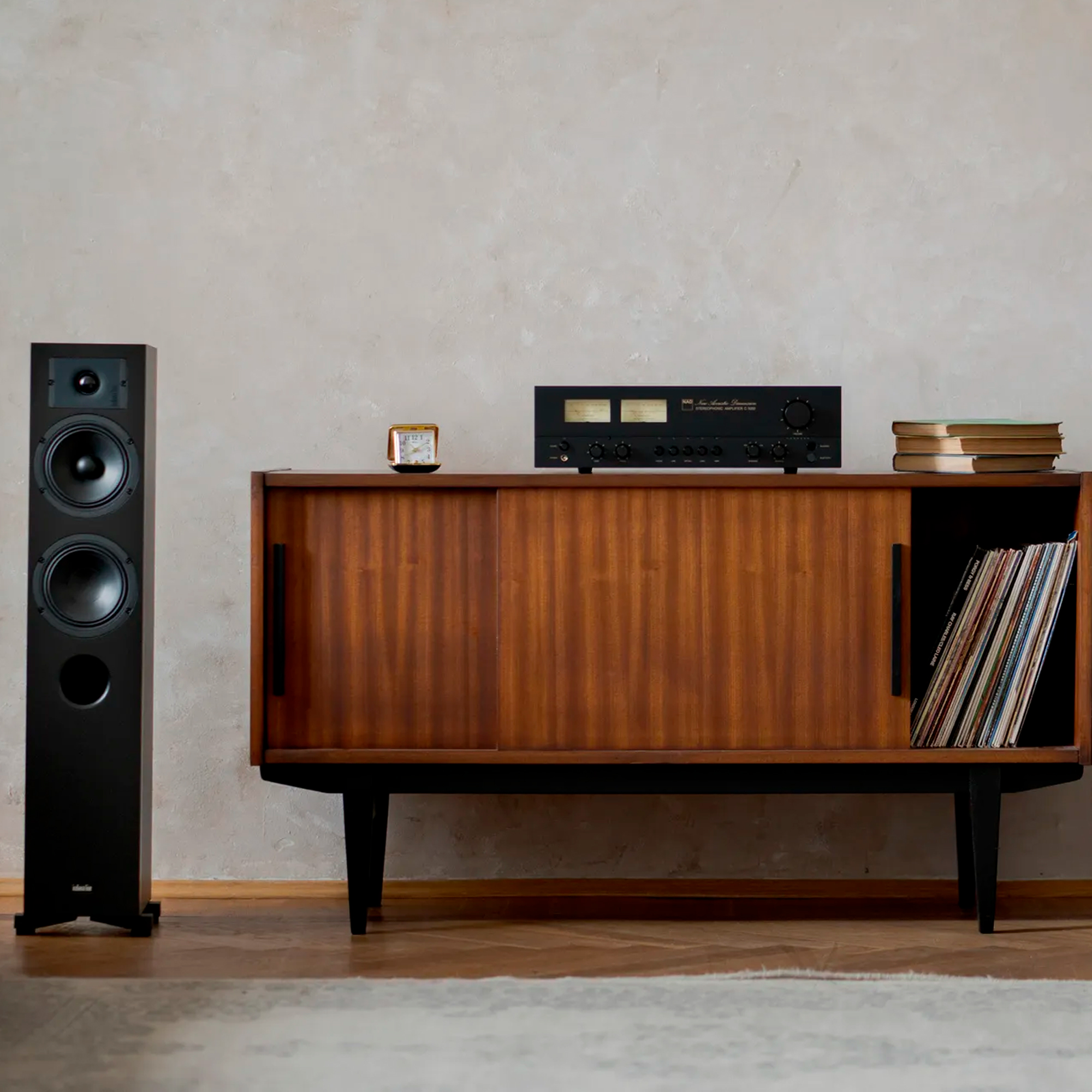 Кабинет Diva 5 имеет двухсекционный корпус из MDF. Фронтальная панель толщиной 30 мм повышает механическую устойчивость корпуса и предотвращает возникновение нежелательных резонансов, что существенно улучшает чистоту звучания. Небольшой наклон передней панели назад, с меньшей глубиной внизу и большей вверху, придает колонне благородный вид. Кабинеты устанавливаются на литые алюминиевые ножки. Привлекательный дизайн Diva 5 подчеркивается акустически прозрачной решеткой с магнитным креплением, заменяющей пластиковые штифты, применявшиеся в предыдущих моделях Diva.