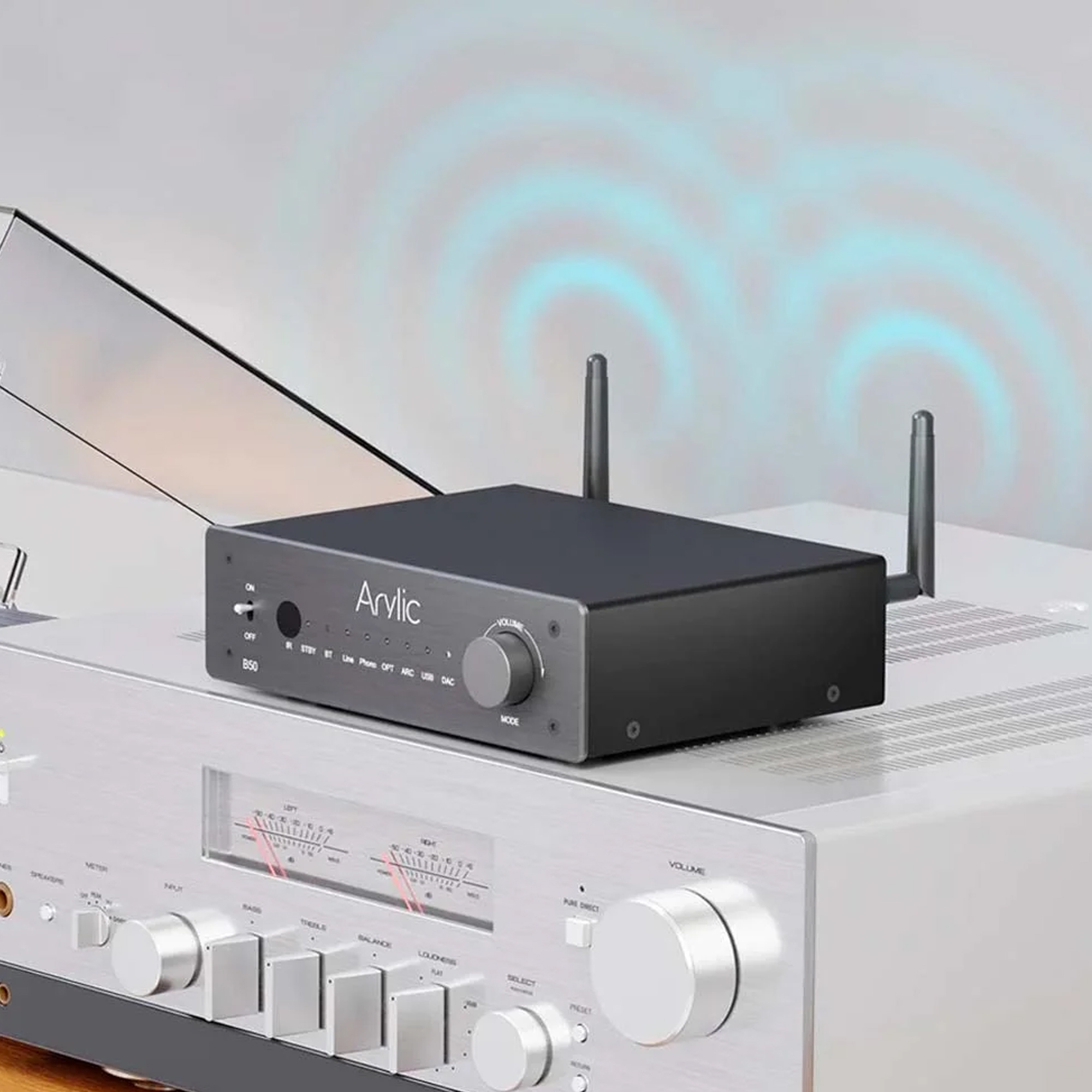 Arylic B50 — это чрезвычайно универсальный и практичный усилитель Bluetooth 5.2, оснащенный, помимо беспроводной связи, широкой панелью разъемов, позволяющей ему адаптироваться к любым ситуациям. Схема усиления обеспечивает мощность 2х50 Вт под 4 Ом или 2х30 Вт под 8 Ом.