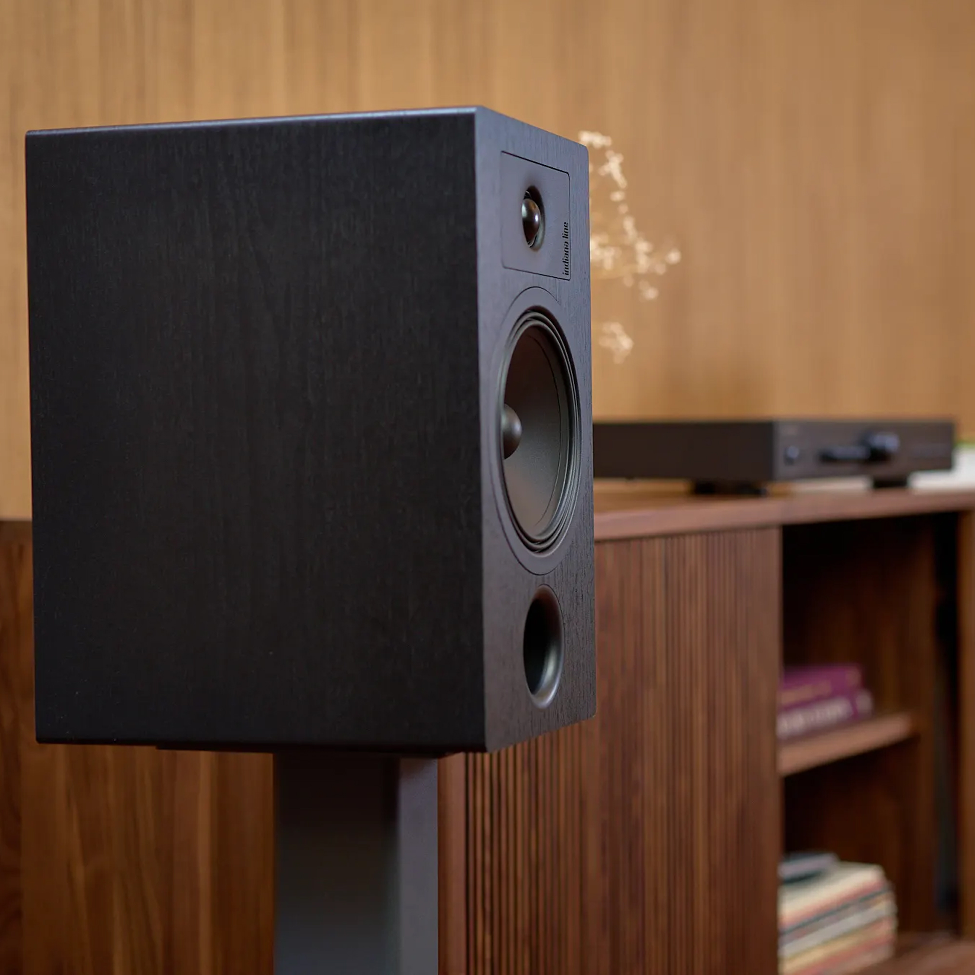 Корпус из MDF усилен внутренними распорками для предотвращения резонансов. Закруглённые углы придают современный и эстетичный вид. Фазоинверторный порт выведен на переднюю панель, что позволяет размещать колонки ближе к стене.