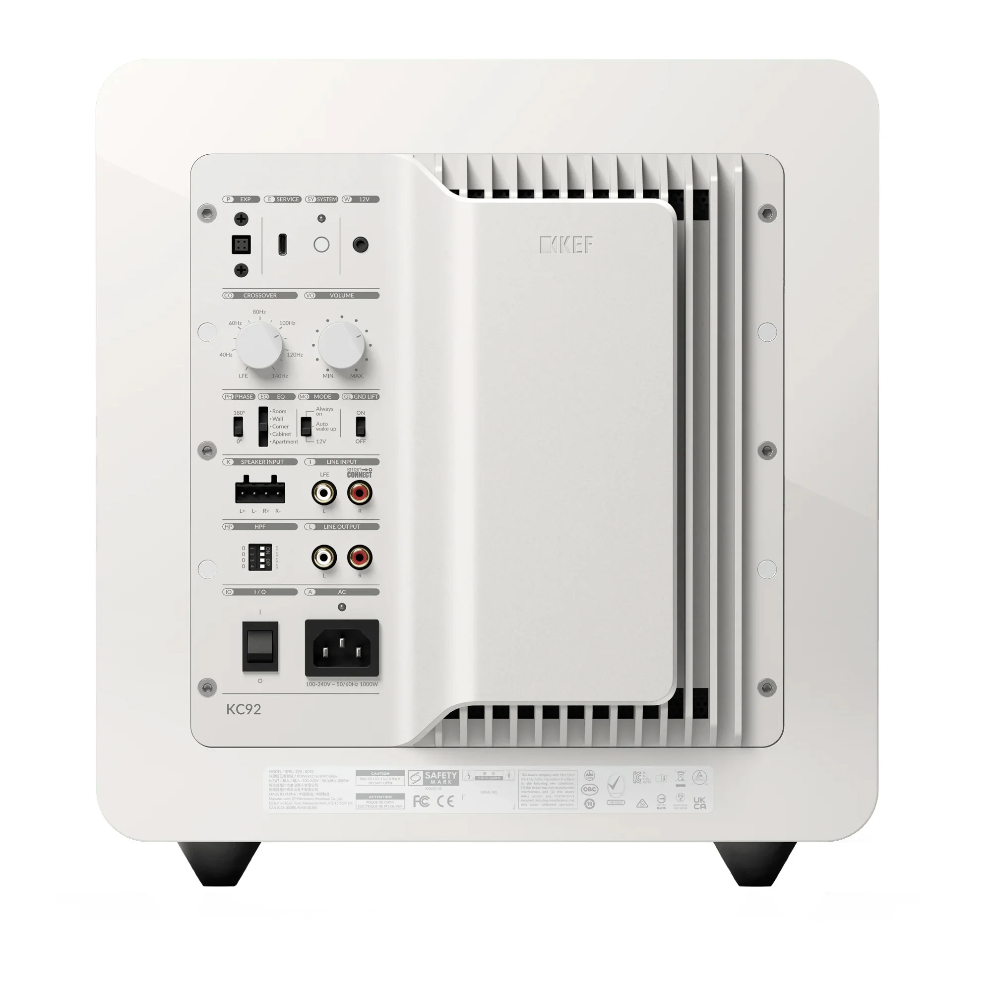 KEF KC92 оснащен линейными и акустическими входами. Система SmartConnect обеспечивает правильную работу секции линейных подключений. Также предусмотрен разъем приемника беспроводного комплекта KW1 (приобретается отдельно). Для управления питанием есть 12-вольтовый триггерный вход и система распознавания наличия входного сигнала.