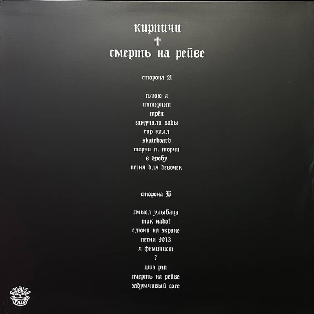 Это коллекционное переиздание культового второго альбома «Смерть на рейве» группы Кирпичи, впервые представленного в виде виниловой пластинки. Это оригинальное (или максимально приближенное к оригиналу) издание на цветном виниле, выдержанное в фирменном миксе оттенков: каждая копия получается уникальной, благодаря ручной подборке окраса. В комплект входит вкладка с текстами песен и подробным оформлением, отражающим визуальную эстетику группы.
