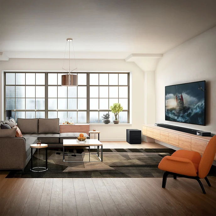 Поставляемый в комплекте пульт ДУ премиум-класса оснащен светодиодными кнопками с датчиком движения, поэтому вы полностью контролируете ситуацию даже при слабом освещении. В дополнение к выбору громкости и входа, пульт дистанционного управления позволяет настраивать уровень сабвуфера, уровень объемного звучания и режим звука одним нажатием кнопки, чтобы получить идеальное впечатление от прослушивания прямо с вашего места.