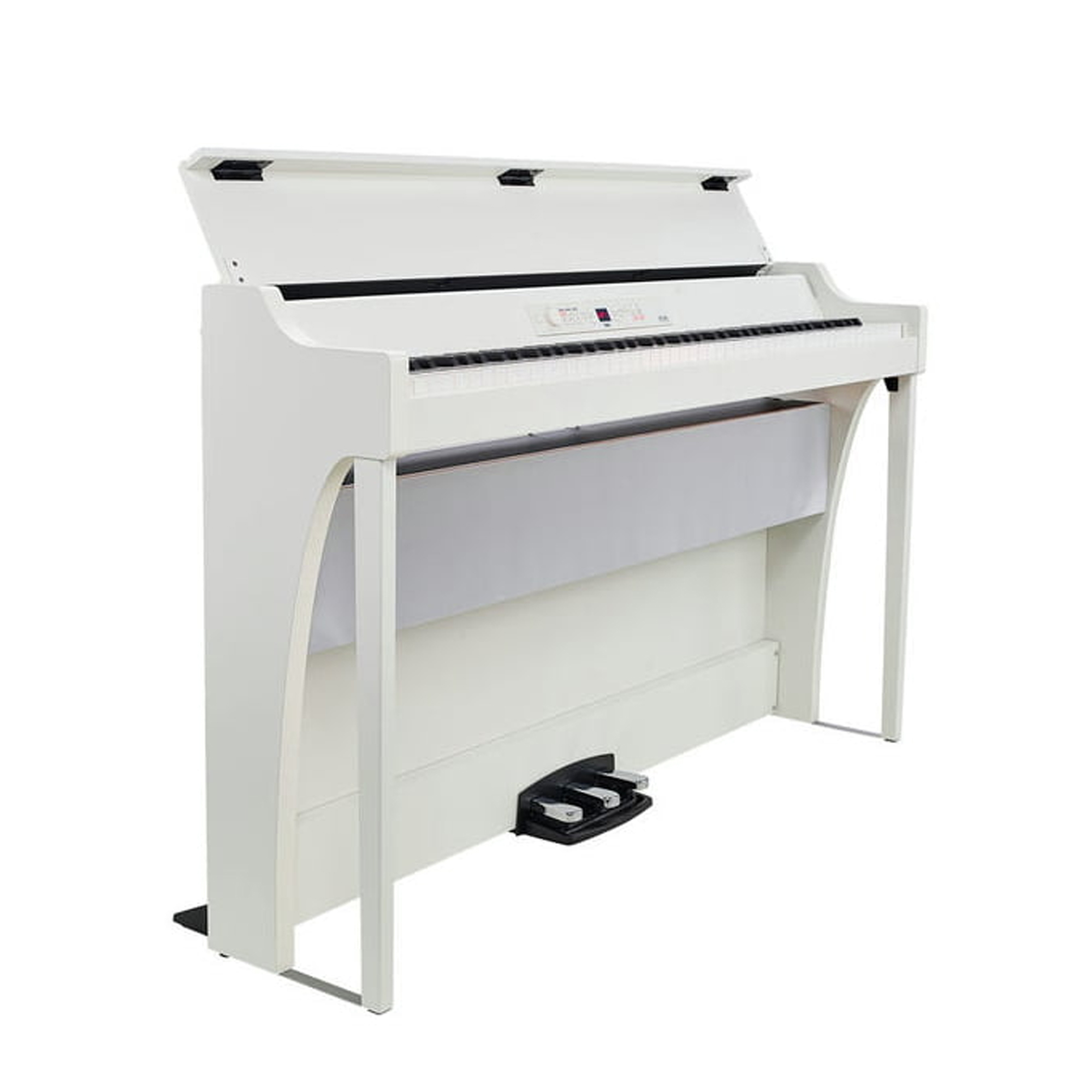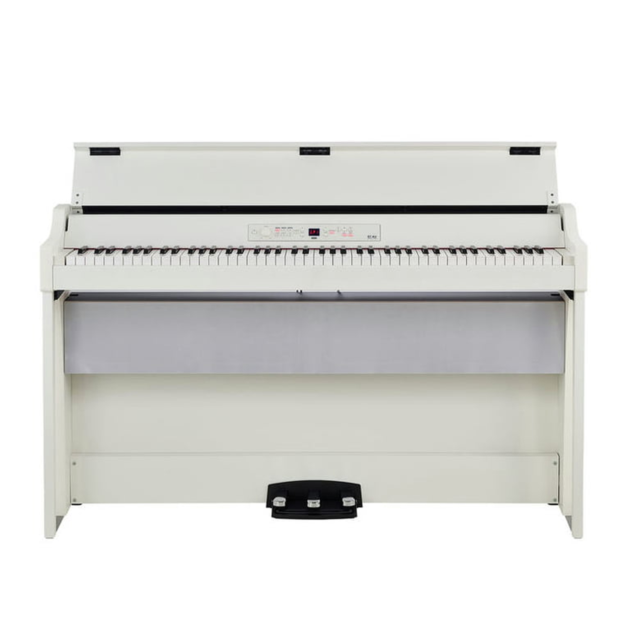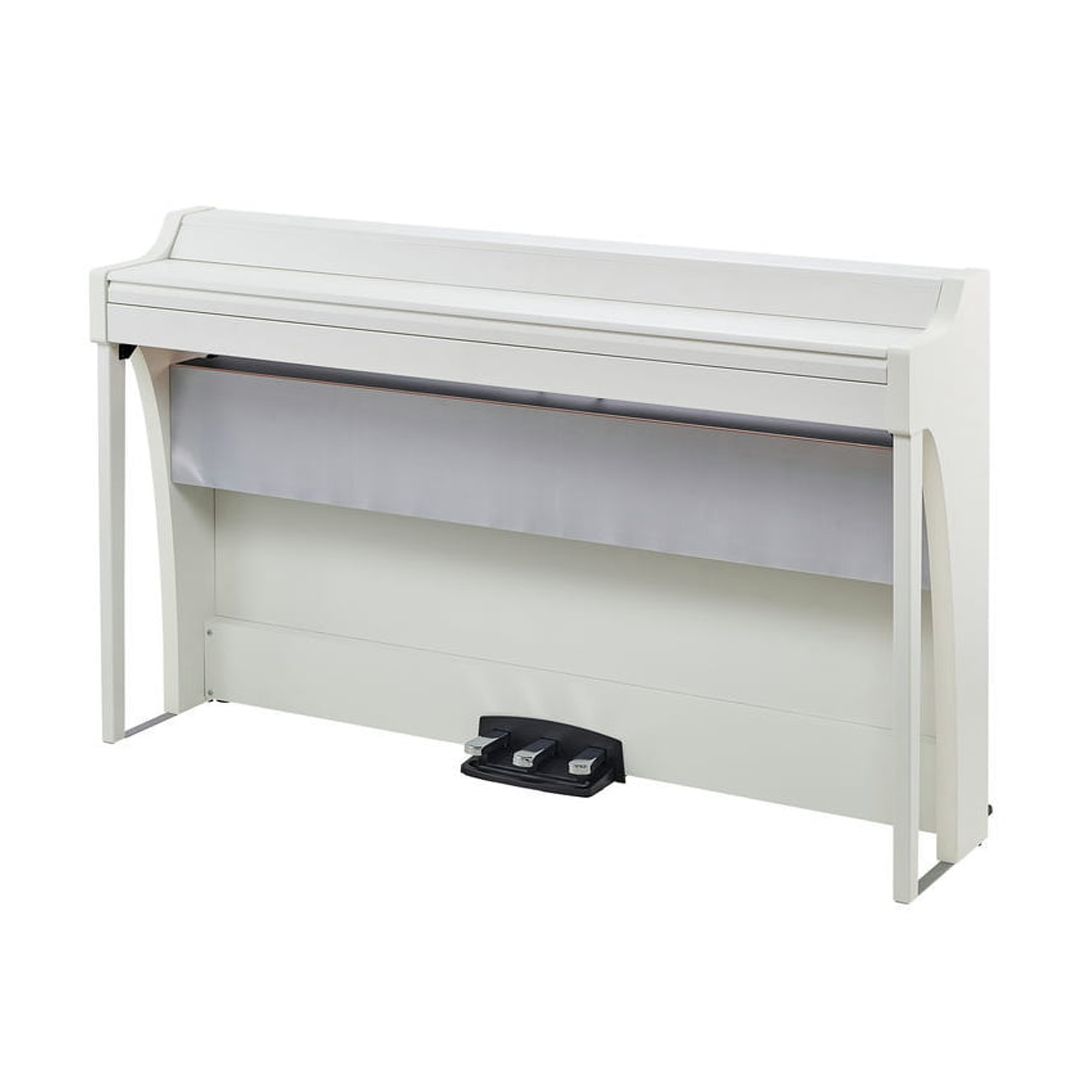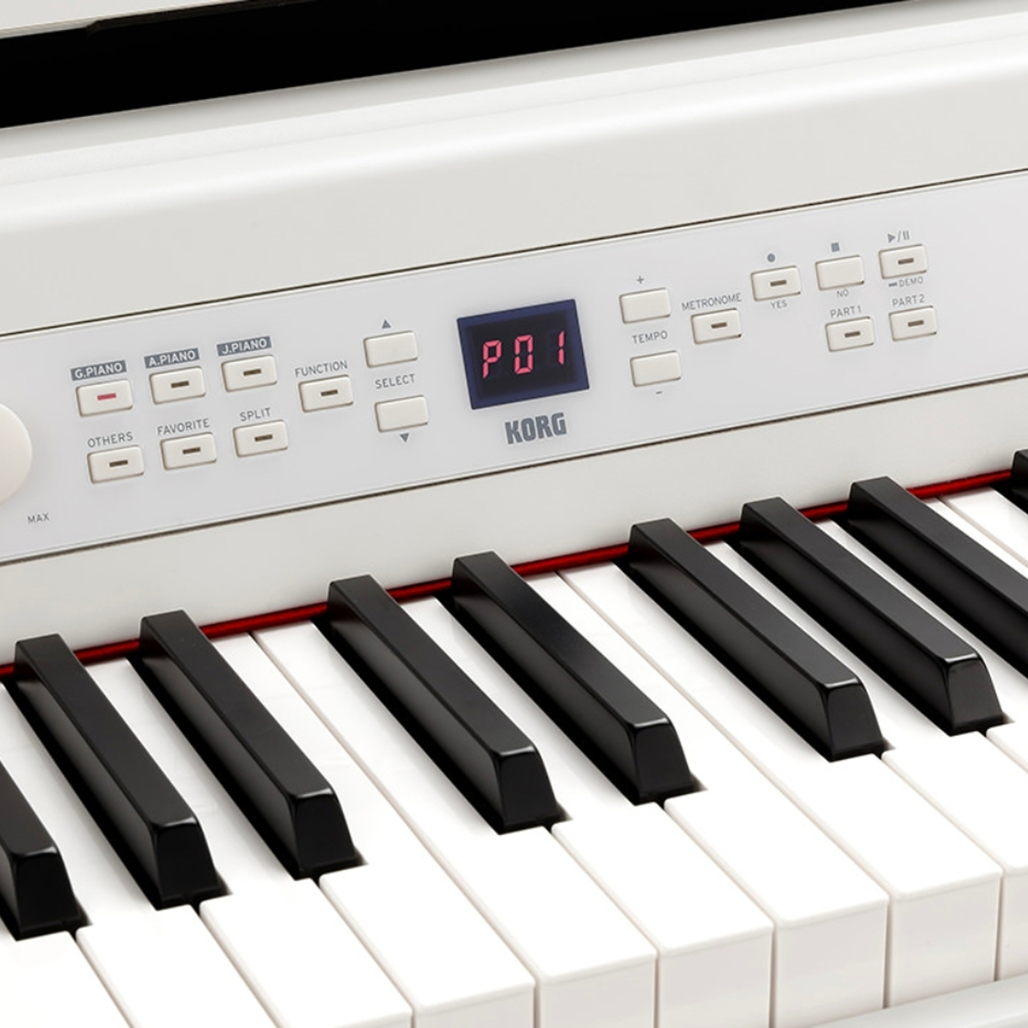По дизайну это один из самых аккуратных корпусных инструментов Korg для дома: тонкий силуэт, высокий задний щит, лаконичная панель управления. Пианино доступно в трёх цветах – чёрном, белом и коричневом, поэтому его реально вписать и в строгий кабинет, и в светлую гостиную. Верхняя часть корпуса с встроенной акустикой направляет звук к исполнителю, а тройная педаль интегрирована так, что выглядит как часть единой конструкции. В собранном виде инструмент внушительный, но визуально не перегружает комнату.