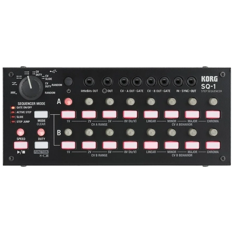 Korg SQ-1 оборудован двухканальным (каналы A и B) 8-шаговым секвенсором, который может работать как в последовательном, так и в других режимах. Например, можно составить из паттернов A и B одну 16-шаговую последовательность, заставить прибор игнорировать порядок следования шагов и играть в случайном порядке или же использовать каналы A и B в параллельном режиме для контроля разных параметров. Режимы выбираются в зависимости от конкретной ситуации. Шаговые кнопки (2x8) можно использовать в обычном режиме для активации или деактивации отдельных нот, однако с помощью кнопки MODE исполнитель может изменить их назначение, что открывает богатейшие исполнительские возможности. В частности, вы можете воспроизводить музыкальные фразы вживую , как на сэмплерах серии volca. Функция Active Step позволяет пропускать шаги, расположенные в середине последовательности, а Step Jump служит для мгновенного перехода к шагу, кнопка которого была нажата. Данный метод позволяет создавать рваный бит или короткие лупы. Параметр Slide управляет плавным переходом от одного шага к другому: таким образом можно легко и быстро создать басовую партию.