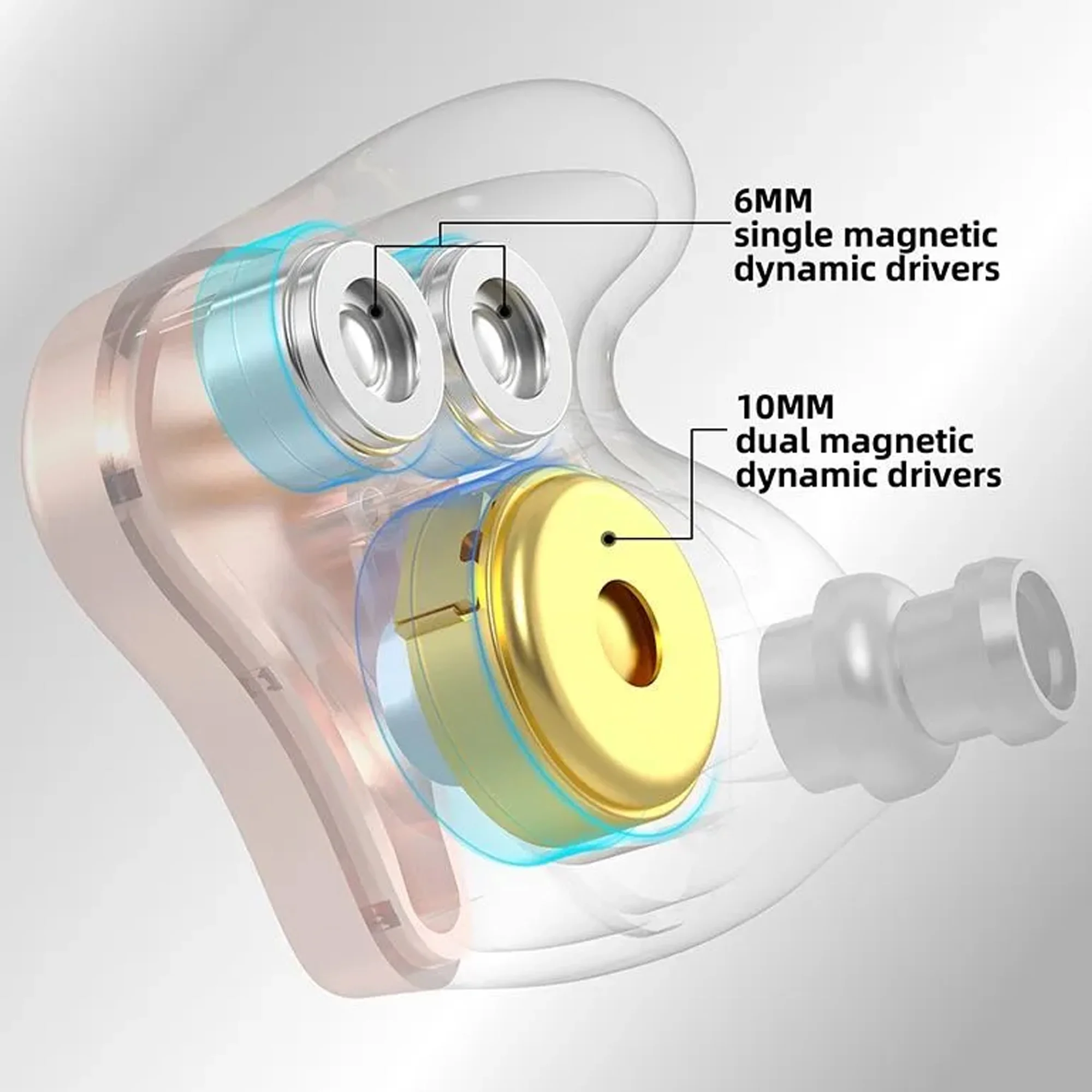 В DQ6S установлен 10-миллиметровый динамический драйвер с молекулярной диафрагмой из ПЭТ-алмаза для достижения более четкого качества звука. По сравнению с традиционным динамическим драйвером, сдвоенный динамик повышает эффективность электроакустического преобразования на 80%, обеспечивая более широкую частотную характеристику и воспроизведение большего количества музыкальных деталей. Кроме того, высокочастотная комбинация 6-миллиметрового массива может оптимизировать проблему недостаточной высокой частоты одиночного динамика и улучшить диапазон звукового поля без какой-либо регулировки, позволяя вам звучать захватывающе в любое время и в любом месте.