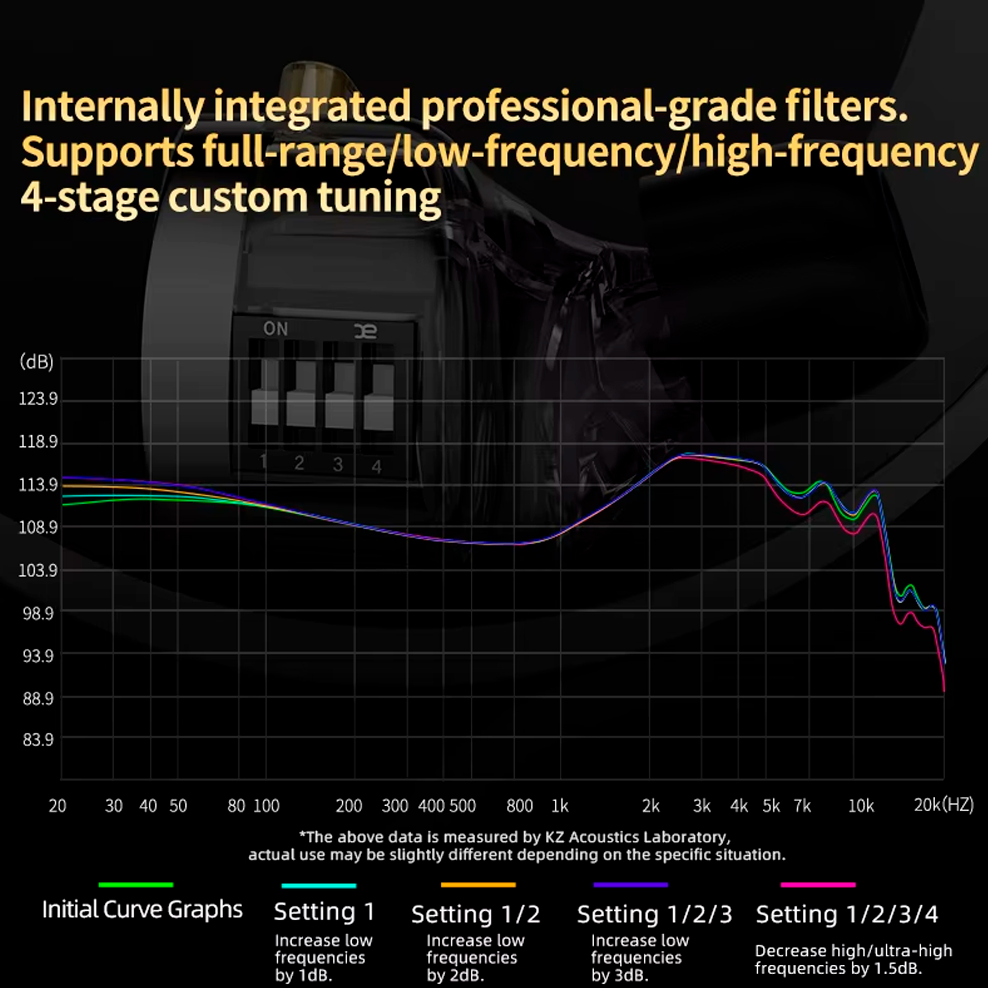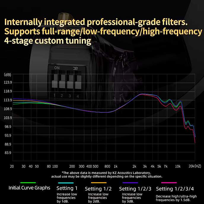 Встроенные фильтры обеспечивают 4-ступенчатую индивидуальную настройку всего диапазона, низких и высоких частот. Возможность регулировки частоты звука является стандартной функцией современных наушников профессионального уровня, что позволяет пользователям настраивать свои слуховые ощущения.
