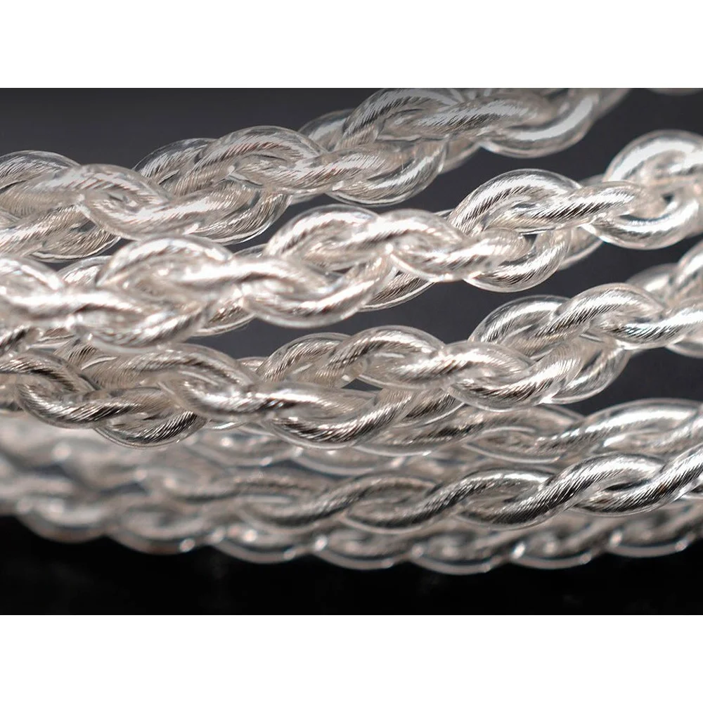 Серебряный кабель, который поставляется в комплекте с наушниками выполнен из качественных материалов и отлично передает аудиосигнал. L-образный штекер и разветвитель выполнены из плотной резины и не изнашиваются даже через несколько лет. Плетеный провод не заламывается, а около коннектора есть небольшой силиконовый заушник для большего комфорта при ношении.