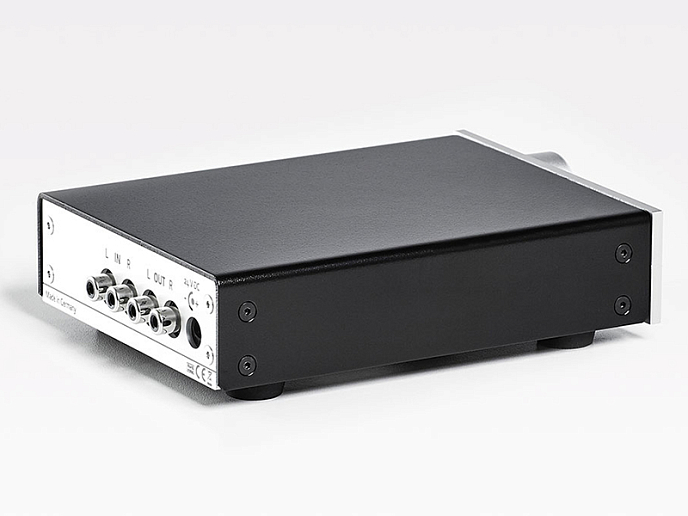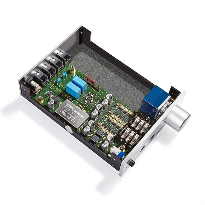 Усилитель оснащен двумя высококачественными 6,3 мм выходами Neutrik для наушников. Оба разъема имеют позолоченные контактные поверхности. Для регулировки громкости предусмотрен высокоточный потенциометр ALPS Blue Velvet, обеспечивающий низкий уровень шума и правильный баланс каналов. В цепях Lehmann Audio Drachenfels установлены слюдяные конденсаторы с металлизированными серебром обкладками и прецизионные MKP-конденсаторы, способствующие улучшению переходных характеристик. Выходная секция работает в A-классе и использует три пары биполярных транзисторов. Что касается дополнительных опциональных печатных плат для апгрейда, то на данный момент уже доступны несколько версий: с ЦАПом и S/PDIF-входами (оптический/коаксиальный), а также с ЦАПом и USB-входом. В будущем планируются варианты с LAN/WLAN на борту и с Bluetooth-модулем. Модель имеет классический аккуратный дизайн и не занимает много места. Фронтальная панель компактного корпуса изготовлена из алюминия. Доступны два вида отделки: серебристая (Silver) или черная (Black). В базовом варианте на тыльной стороне корпуса находится гнездо для подключения внешнего блока питания, RCA-вход и регулируемый выход Pre Out на разъемах RCA, благодаря которому Lehmann Audio Drachenfels можно использовать в качестве предусилителя и подключать к нему активные акустические системы или оконечник. На фронтальной панели находится кнопка подачи питания и перевода в режим standby, в котором потребляемая мощность усилителя составляет менее 1 Вт.