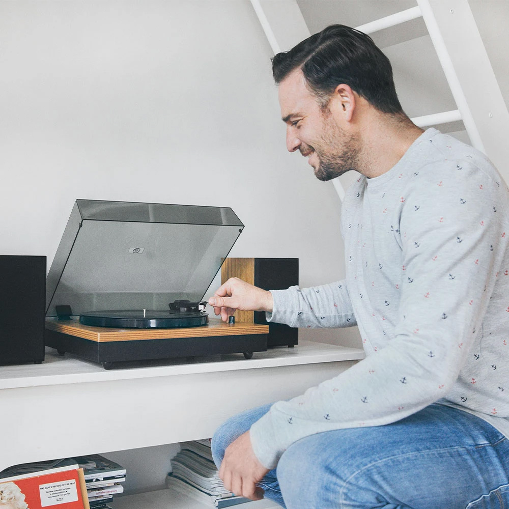 LS-300 - проигрыватель винила в деревянном корпусе с двумя внешними колонками. Это комбинация аналогового звука, ретро дизайна и современных технологий в одном устройстве. Колонки можно разместить отдельно от проигрывателя для создания настоящего стереоэффекта.