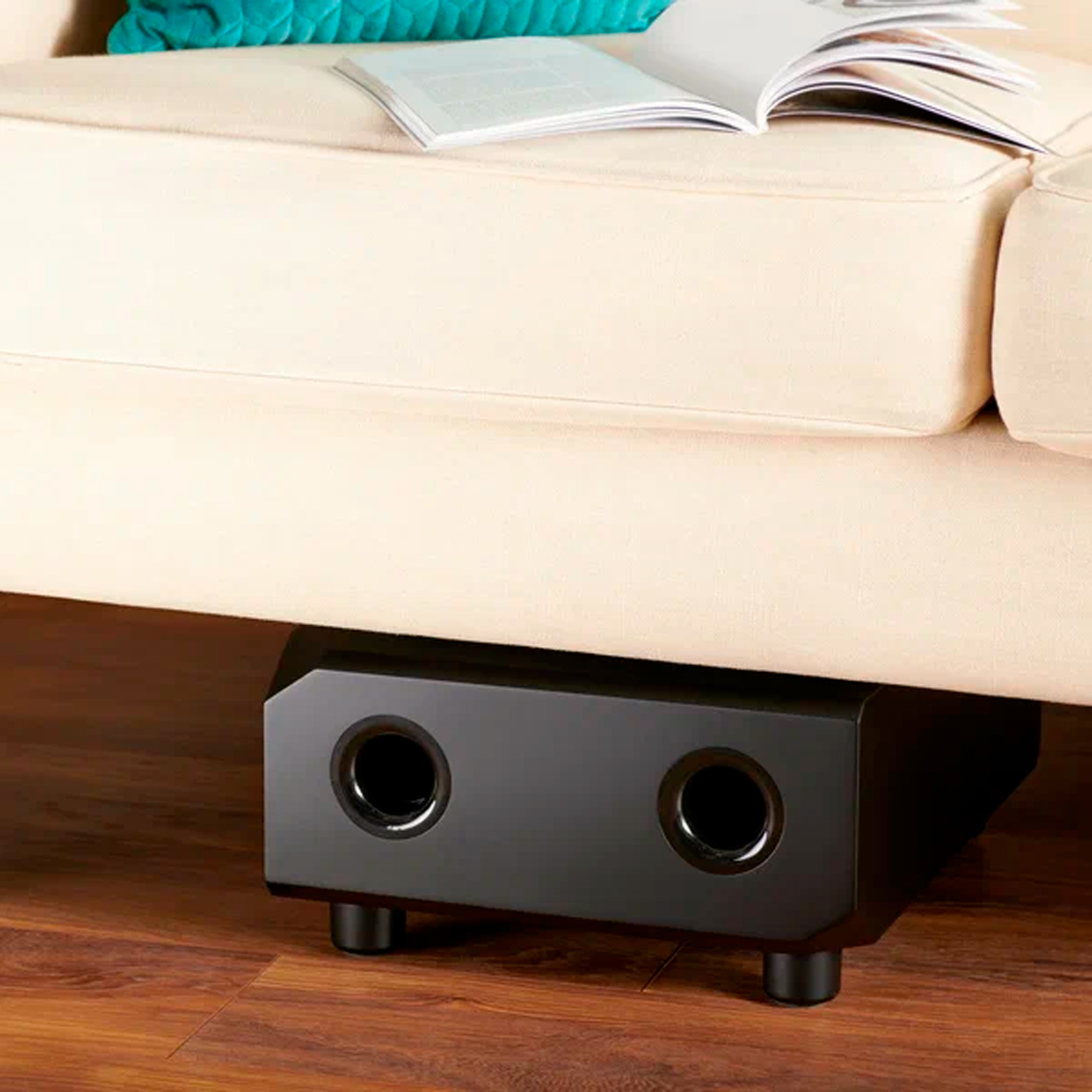 Мощность и конструкция: встроенный усилитель класса D выдает 150 Вт RMS (среднеквадратичной мощности), обеспечивая мощное и чистое звучание низких частот без искажений. Сабвуфер оснащен одним 8-дюймовым (20 см) низкочастотным динамиком, направленным вниз (downward-firing), и двойными портами фазоинвертора для максимальной отдачи баса в компактном корпусе.