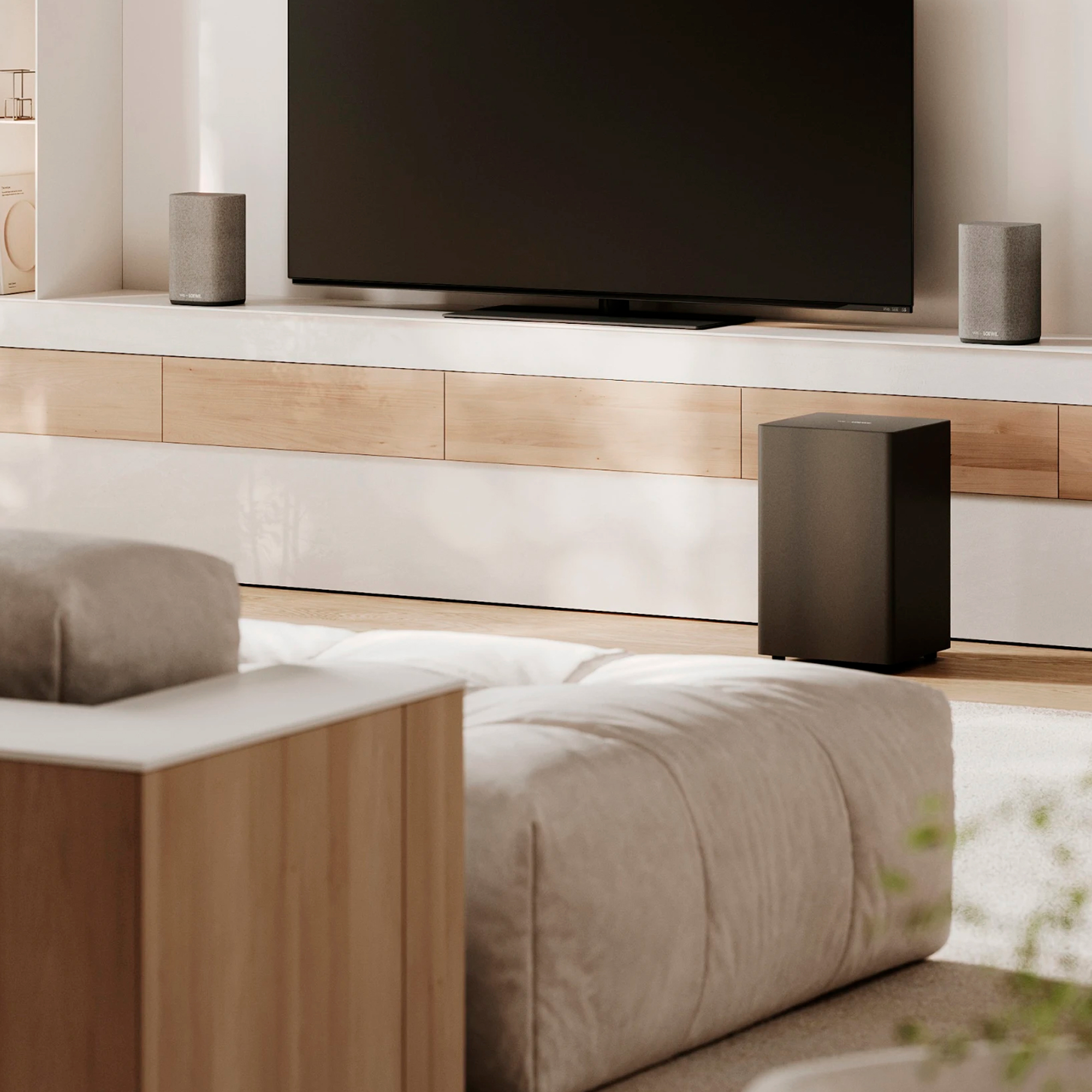 Забудьте о путанице проводов. Беспроводные активные сателлитные колонки и сабвуфер We. BOOST созданы с учётом максимального удобства и минимального беспорядка, позволяя легко создать аккуратную и стильную систему домашнего кинотеатра.
