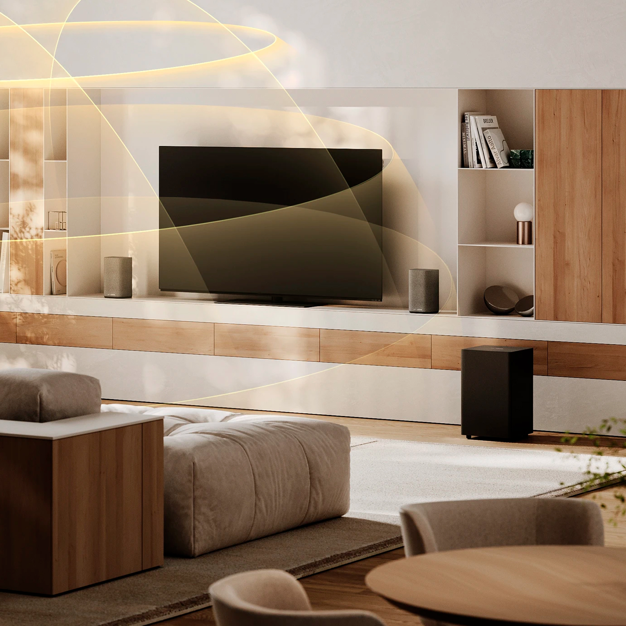 Система Loewe We. BOOST поддерживает передовые технологии Dolby Atmos, Dolby Digital и PCM, чтобы создать настоящее объёмное 3D-звучание, окружающее вас со всех сторон. Каждая сателлитная колонка оснащена динамиком, направленным вверх, что позволяет звуку распространяться не только по горизонтали, но и по вертикали, обеспечивая по-настоящему погружающий звуковой опыт.