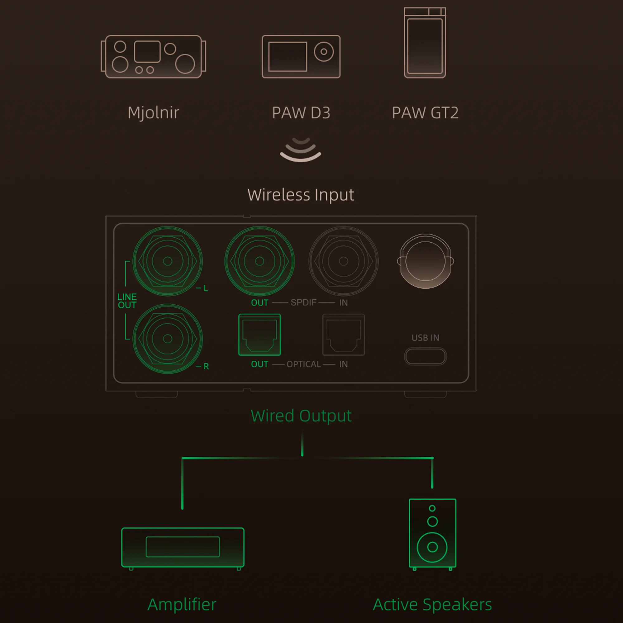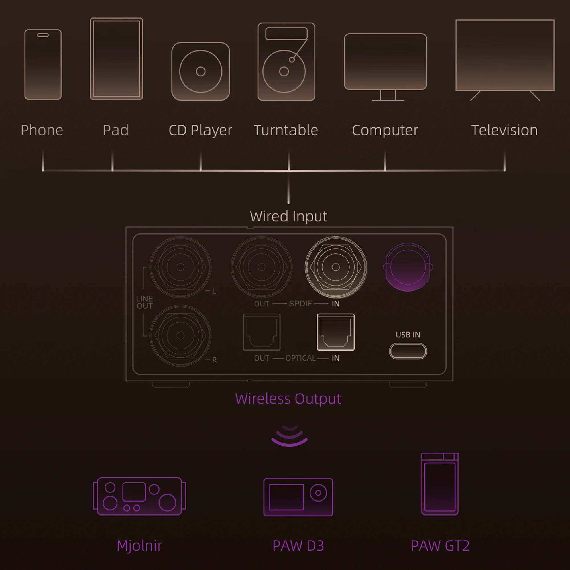 На базе передового цифро-аналогового преобразователя AKM AK4493EQ устройство поддерживает декодирование DSD256 и воспроизведение аудио с высоким разрешением. PAW D3 также реализует фирменный стандарт беспроводной передачи звука LTTP, обеспечивая передачу и приём цифрового сигнала без потерь между совместимыми устройствами.
