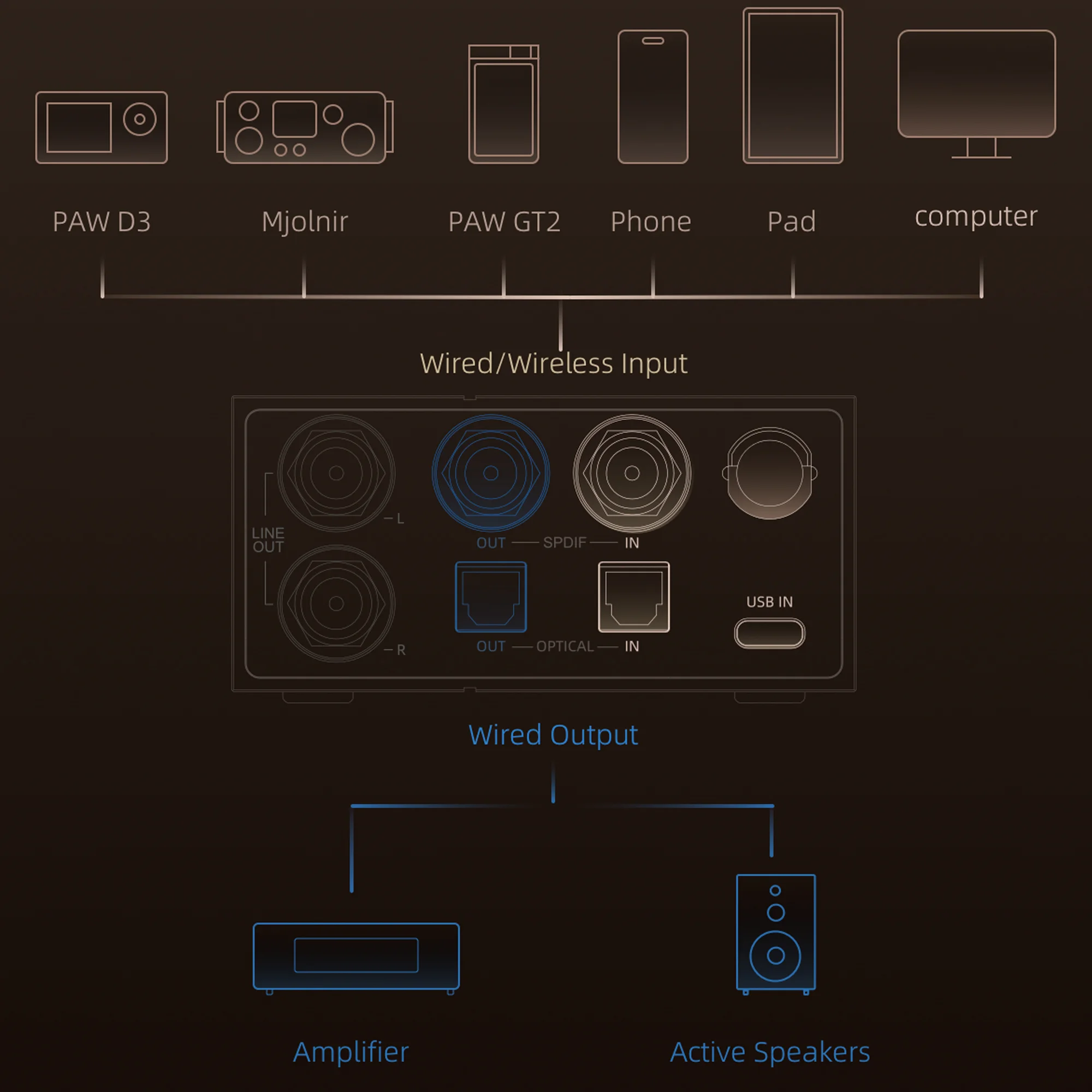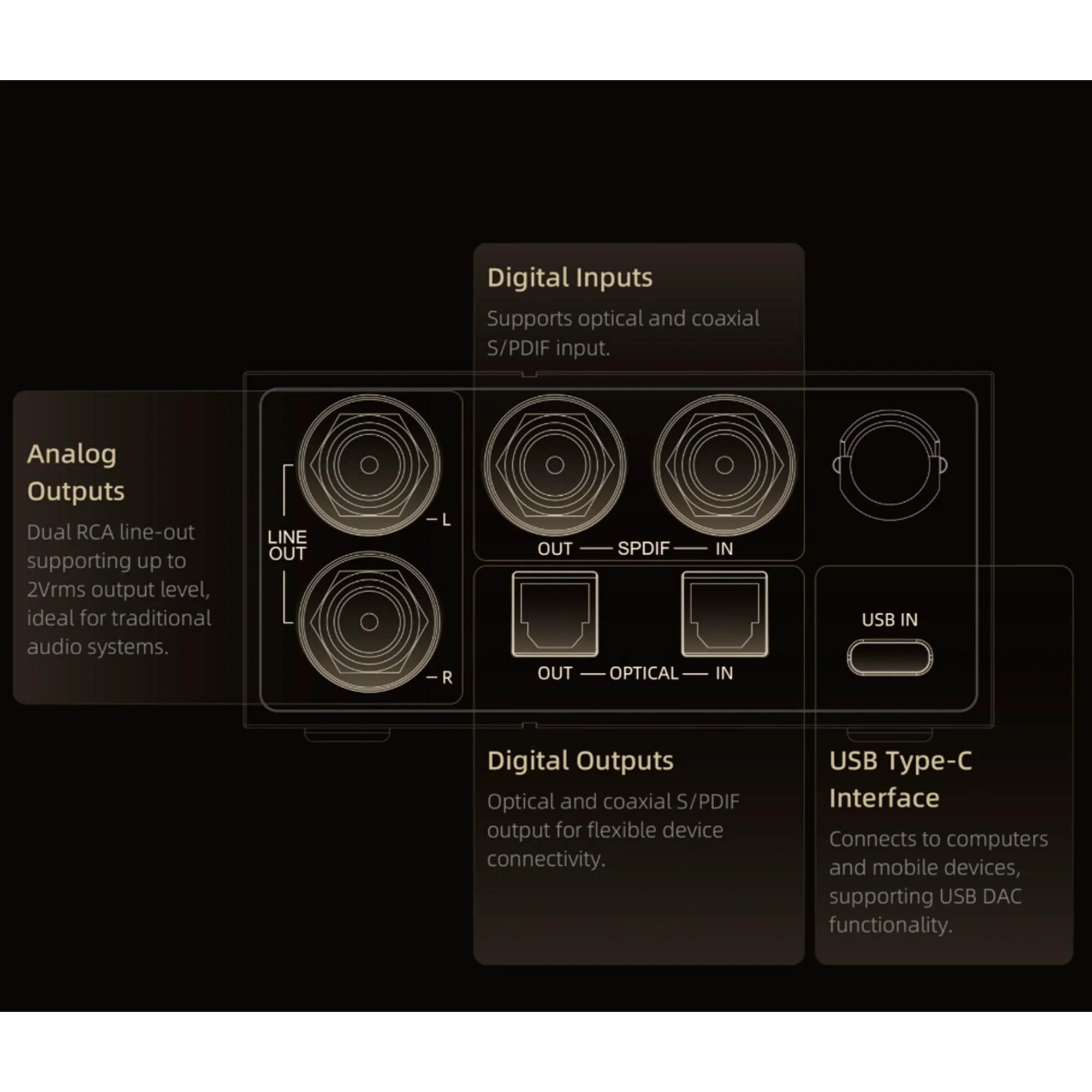 На борту предусмотрены аналоговый выход через RCA, цифровые входы/выходы (оптический и коаксиальный), а также порт USB-C для подключения к ПК и мобильным устройствам с поддержкой режима USB DAC. Устройство легко интегрируется в стационарные и мобильные системы, благодаря продуманной архитектуре и гибкому набору функций.