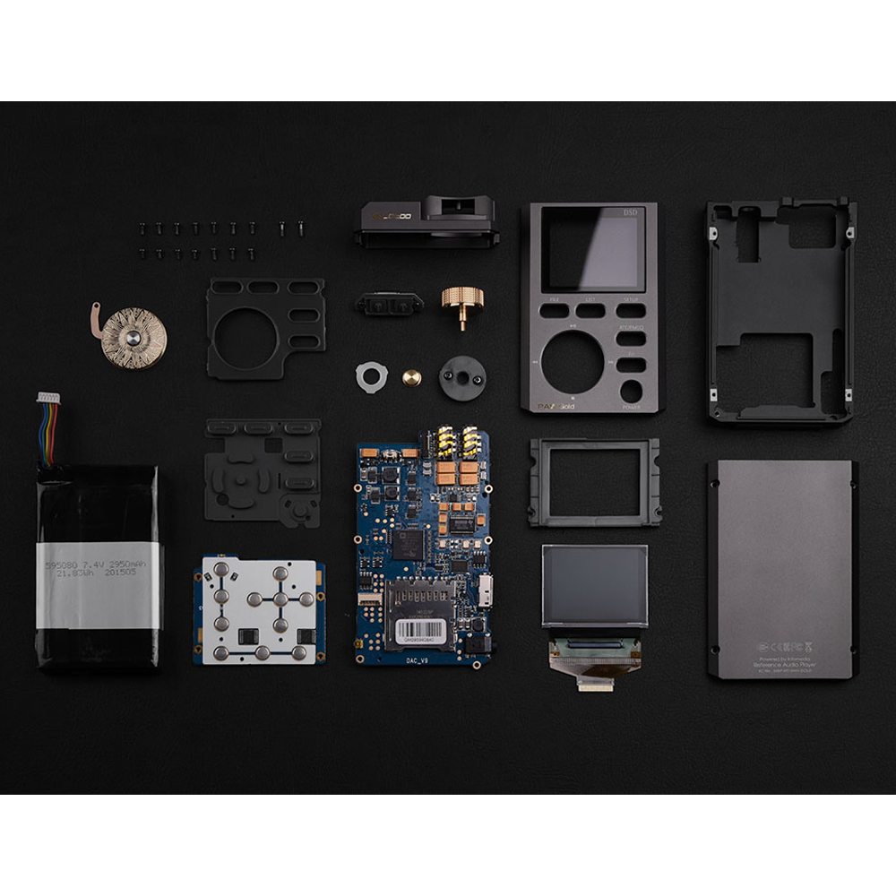 Фронтальная часть плеера встречает 1.8 дюймовым OLED экраном, защищенным сверхпрочным сапфировым стеклом. Под дисплеем находятся 5 пластмассовых клавиш, имеющие плавную степень нажатия и передающих приятные тактильные ощущения. В нижней части корпуса пользователь найдет слот для карты памяти SDHC / SDXC, позволяющий расширить память до 2 Тб.