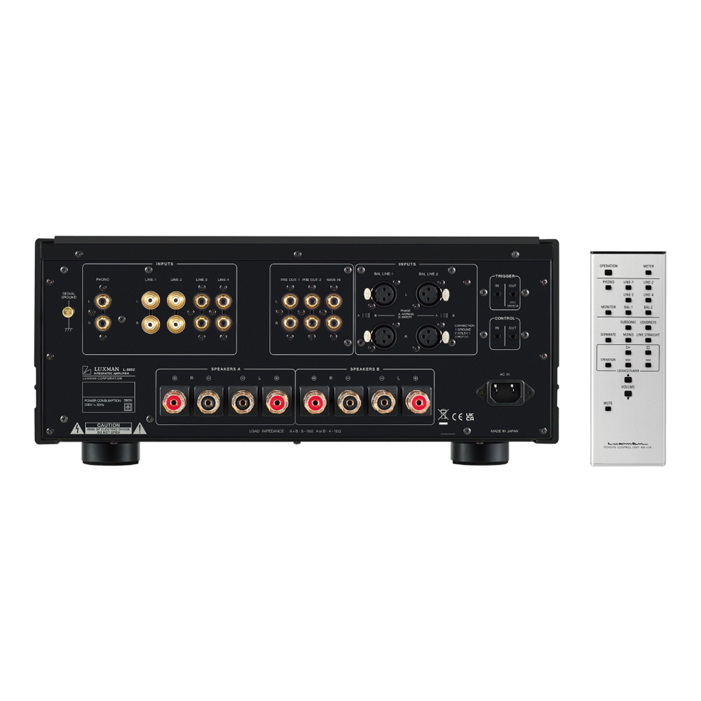 Для подключения к линиям 1 и 2 используются оригинальные высокочастотные разъемы RCA. Для расширения системы предусмотрены отдельные входы и выходы с двумя предварительными выходами. Два больших выходных разъема для динамиков с независимым включением/ выключением обеспечивают двухпроводное подключение. Солидный эргономичный пульт дистанционного управления из алюминиевого сплава также позволяет управлять совместимыми проигрывателями компакт-дисков LUXMAN, выпущенными после 1996 года.