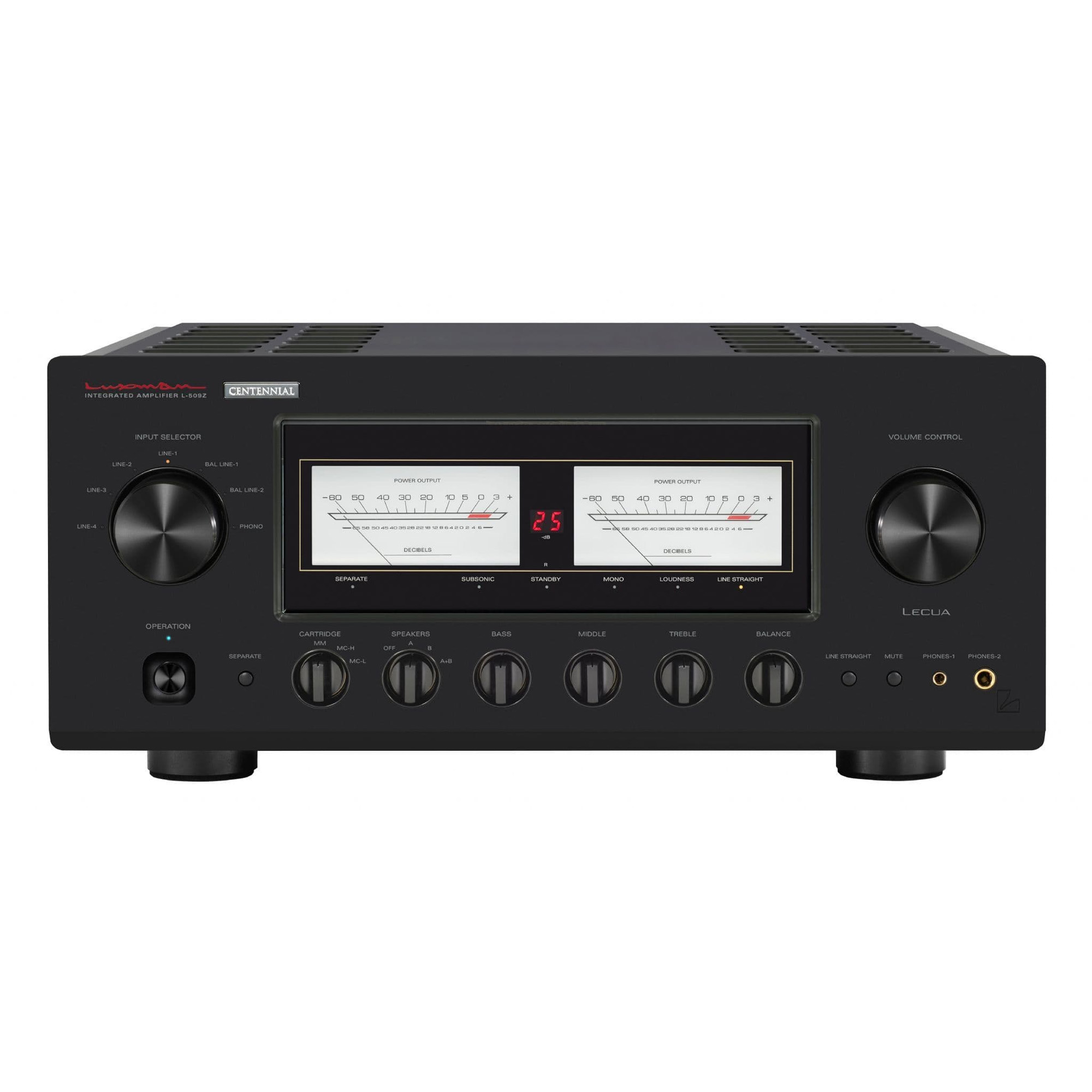 Аналоговые VU-измерители с игольчатым механизмом - это традиционное дизайнерское решение, с гордостью характеризующее твердотельные интегральные усилители LUXMAN. L-509Z оснащен двумя большими измерительными приборами с яркой подсветкой светодиодами и чувствительными характеристиками отклика. Новый 7-сегментный светодиодный дисплей, расположенный между левым и правым уровнемерами, отображает текущую величину ослабления и хорошо виден с места прослушивания.