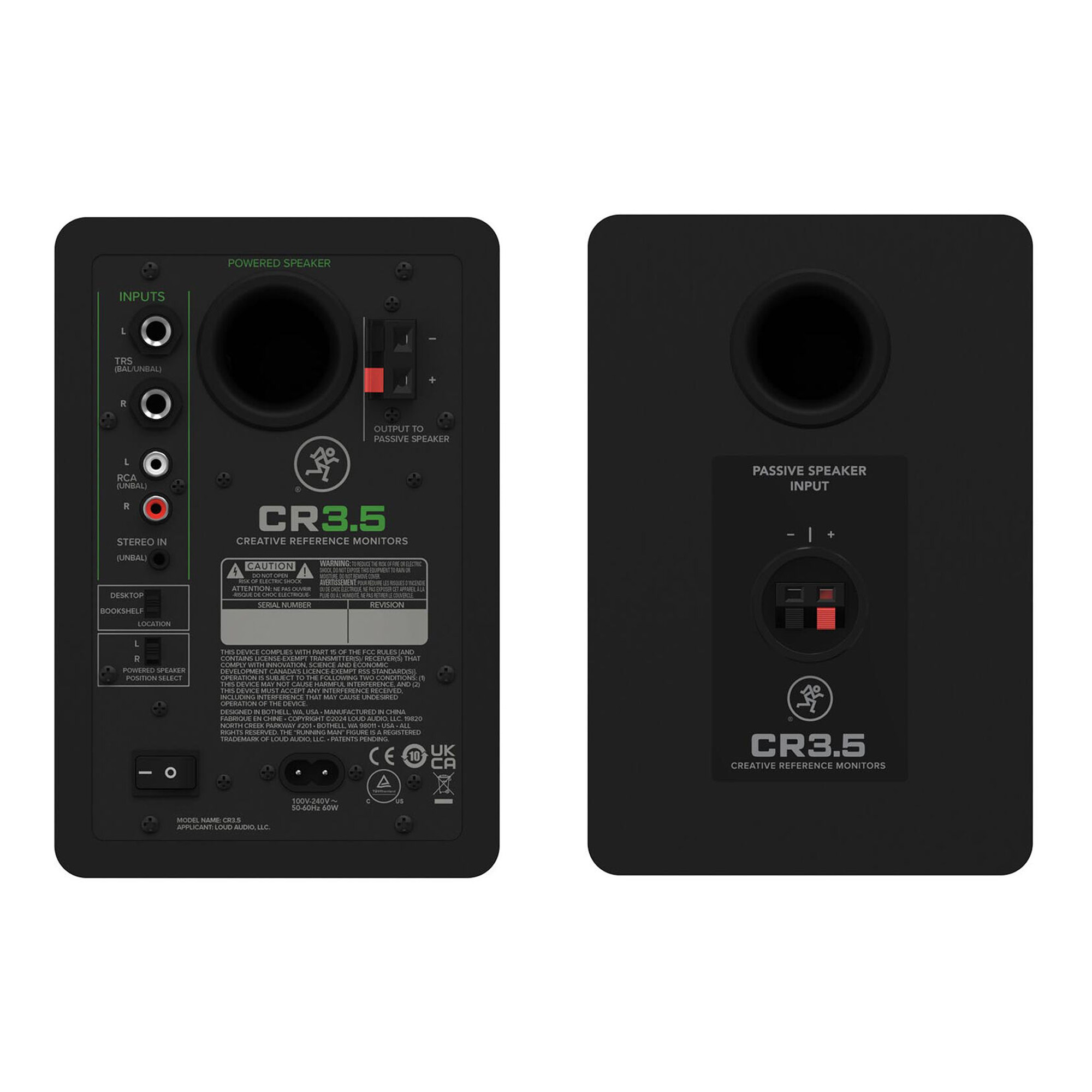 Корпус изготовлен из прочного МДФ с виниловым покрытием и оснащен трубой фазоинвертора, которая располагается сзади и служит для расширения низкочастотной границы диапазона. Питание осуществляется от сети. В комплект поставки входят кабели 1/8'' Jack TRS to 2RCA и 1/8'' Jack TRS to 1/8'' Jack TRS, а также виброизолирующие ножки для каждой из колонок. Для усиления НЧ-диапазона можно отдельно приобрести активный сабвуфер Mackie CR8S.