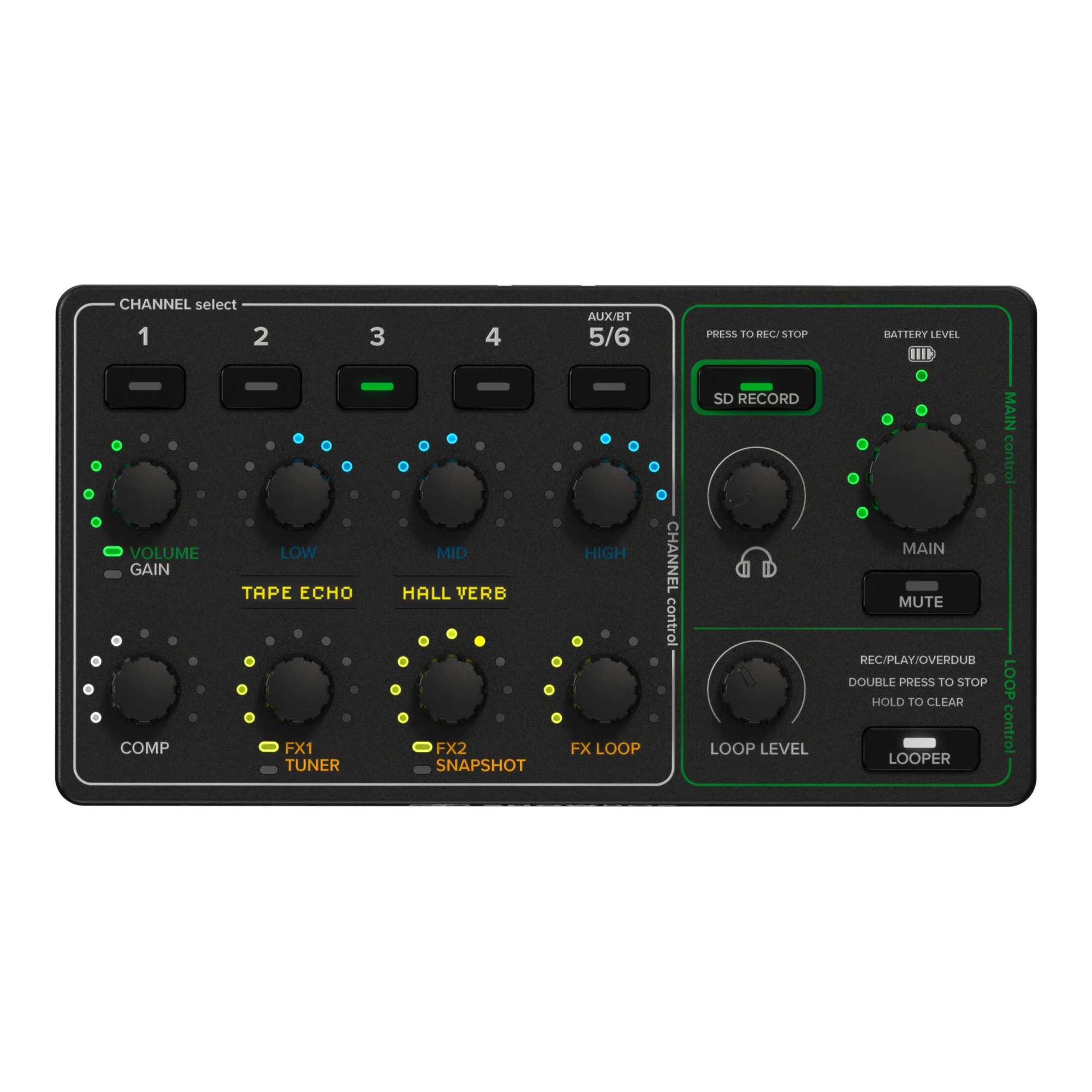 Включите отдельные эффекты для каждого из четырех микрофонных и инструментальных каналов, включая фузз, овердрайв, ламповую модель, акустический усилитель, тремоло и другие. Затем объедините все это с двумя дополнительными модулями эффектов для создания эффектов, основанных на времени, таких как задержка и реверберация.