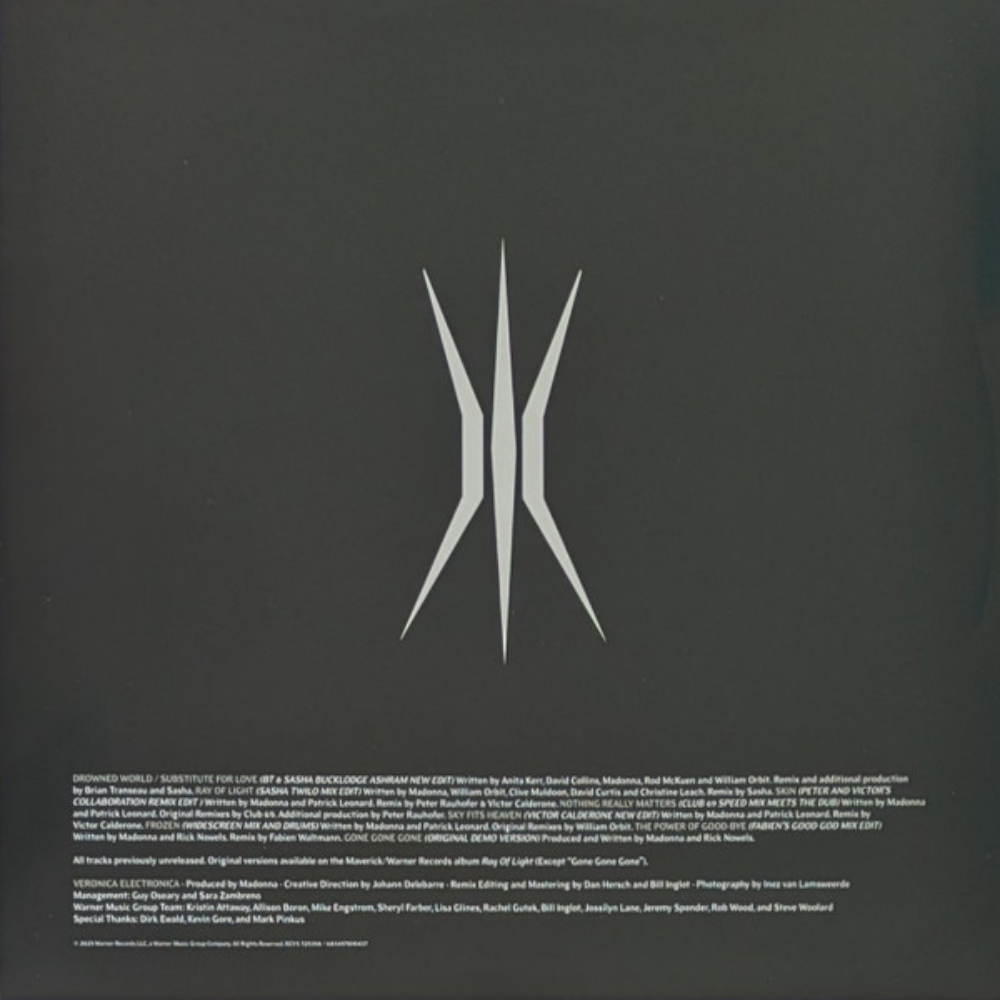 Особой драгоценностью Veronica Electronica является ранее не издававшаяся демоверсия “Gone, Gone, Gone”, записанная Мадонной совместно с Риком Ноуэлсом. Это редкий взгляд внутрь студии, где рождаются идеи, показывающий Мадонну в момент творческого поиска. Оригинальный трек стал главным аргументом в пользу того, что этот релиз - не просто коллекционная вещь, а полноценная глава её дискограции.