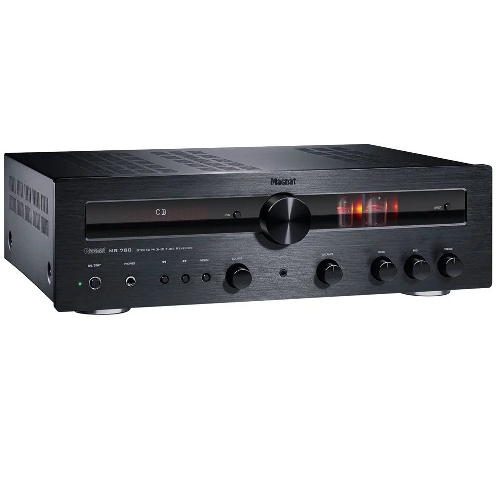 Magnat MR 780 включает в себя: интегрированный усилитель с ламповым предварительным каскадом, фонокорректор, ЦАП с USB и SPDIF входами, FM/DAB тюнер, Bluetooth-приемник версии 4.0 с aptX, усилитель для наушников и даже трехполосный эквалайзер.