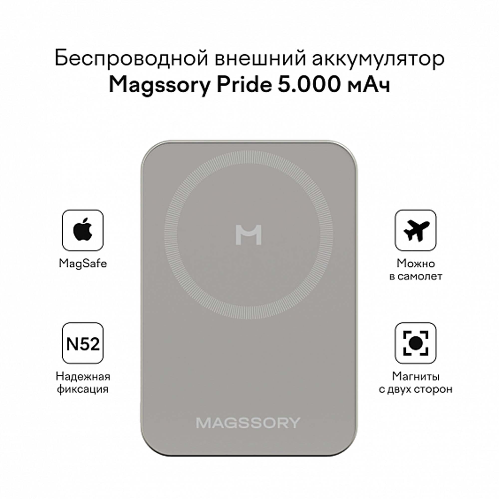 Magssory Pride сочетает в себе высокие технологии и стильный дизайн, предлагая удобство и мощность для повседневного использования. Оснащен литий-кобальтовым аккумулятором емкостью 5000 мАч, обеспечивая длительное время работы. Аккумулятор позволяет одновременно заряжать два устройства: одно беспроводным способом, а другое по кабелю. Кроме того, функция сквозной зарядки позволяет одновременно заряжать сам аккумулятор и подключенный к нему смартфон.