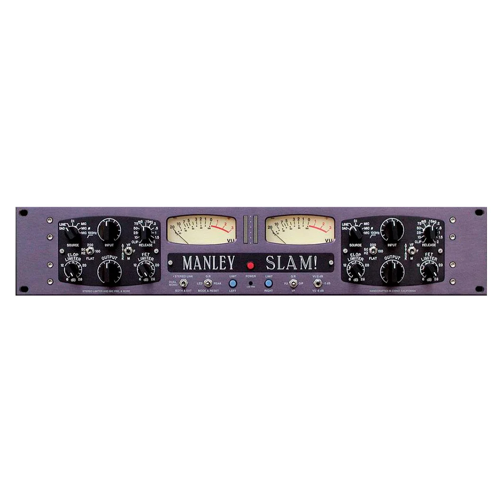 Каждый канал устройства оснащен ручками регулировки порога для ELOP лимиттера, уровня входа и выхода, порога FET лимиттера и его времени восстановления. Также каналы имеют по два тумблера, один из которых переключает частоты сайдчейн фильтра ELOP, а другой - время атаки лимиттера FET между очень быстрым (VF), быстрым (F) и умеренно быстрым (M). Все регуляторы на лицевой панели являются дискретными, в основном, с шагом 1 дБ (некоторые с шагом ½ дБ или 2 дБ). Мастеринговая версия лимиттера MANLEY SLAM! имеет функцию True Hard-wire Bypass (только стерео). В дополнение к большим аналоговым VU индикаторам на лимиттере установлены светодиодные индикаторы уровня.
