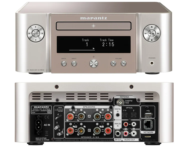 CD-ресивер имеет шикарную внешнюю отделку, в которой сочетаются черное лаковое покрытие и золотистые элементы. Передняя панель обладает красивой подсветкой, а расположенный на ней трехстрочный OLED-дисплей не создает помех аудио схемам. Marantz M-CR612 Melody X оснащен четырехканальным усилителем, поэтому может работать на две пары АС (с независимой регулировкой громкости для каждой) или на одну пару с удвоенной мощностью.
