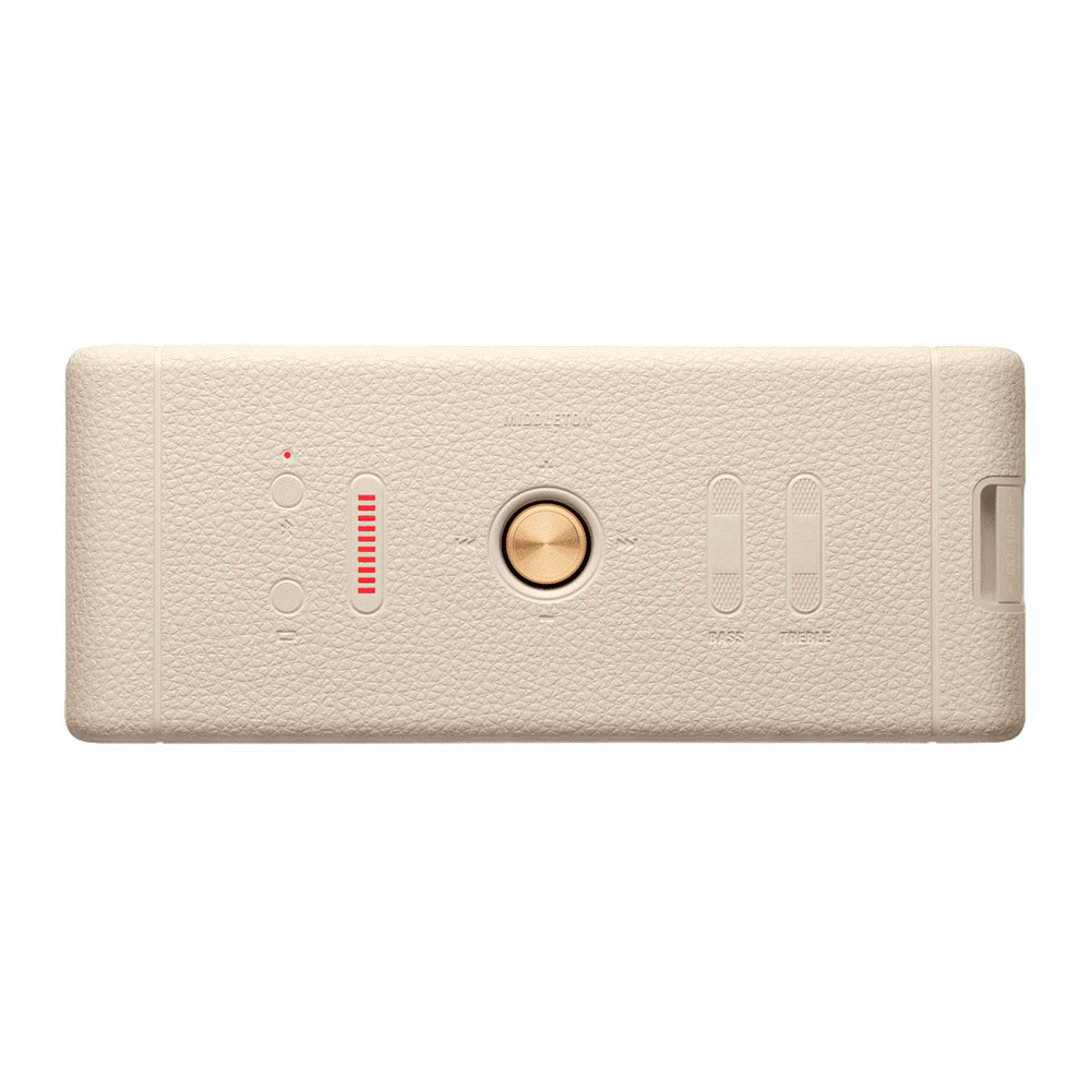 Новая портативная колонка Middleton очень красива и компактна. Представлена в крепком корпусе и двух классических цветах Black и Cream. Передняя панель имеет фирменное оплетение тканью с золотым логотипом Marshall в центре динамика. Первоклассная степень пыле- и водонепроницаемости IP67, позволяет колонке Middleton не бояться никаких внешних воздействий. Компактный и портативный дизайн делает ее идеальным компаньоном для путешествий, походов или просто для использования дома или в офисе. Она легкая и легко помещается в сумку или рюкзак, поэтому вы можете брать ее с собой куда угодно.