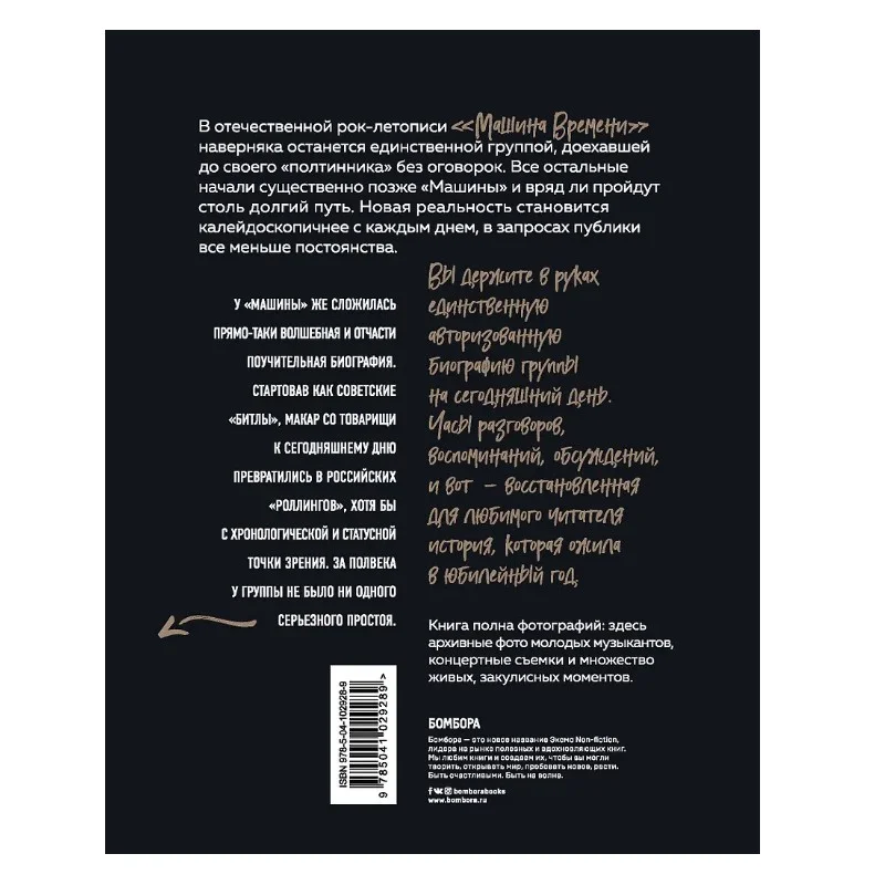 Единственная биография группы "Машина Времени", созданная при участии самой группы. Часы разговоров, воспоминаний, обсуждений, и вот — восстановленная для любимого читателя история, которая ожила в юбилейный год. Книга полна фотографий: здесь архивные фото молодых музыкантов, концертные съемки и множество живых, закулисных моментов. Михаил Марголис — один из самых крутых музыкальных журналистов, близкий друг "Машины", человек тонкого вкуса, судите сами: "В отечественной рок-летописи "Машина Времени" наверняка останется единственной группой, доехавшей до своего "полтинника" без оговорок. Все остальные начали существенно позже "Машины" и вряд ли пройдут столь долгий путь. Новая реальность становится калейдоскопичнее с каждым днем, в запросах публики все меньше постоянства. У "Машины" же сложилась прямо-таки волшебная и отчасти поучительная биография. Стартовав как советские "битлы", Макар со товарищи к сегодняшнему дню превратились в российских "роллингов", хотя бы с хронологической и статусной точки зрения. За полвека у группы не было ни единого серьезного простоя. Добро пожаловать на борт! .2019 год – юбилейный для «Машины Времени». Группа, которая отмечает свои 50 лет без оговорок. .Здесь вся история «Машины», рассказанная самим Макаревичем и Михаилом Марголисом. Беседа двух друзей, воспоминания, как же это было, люди, которые творили историю! .Множество архивных фотографий, стильная обложка. .Книга станет отличным подарком любому фанату, а также украшением книжной полки!