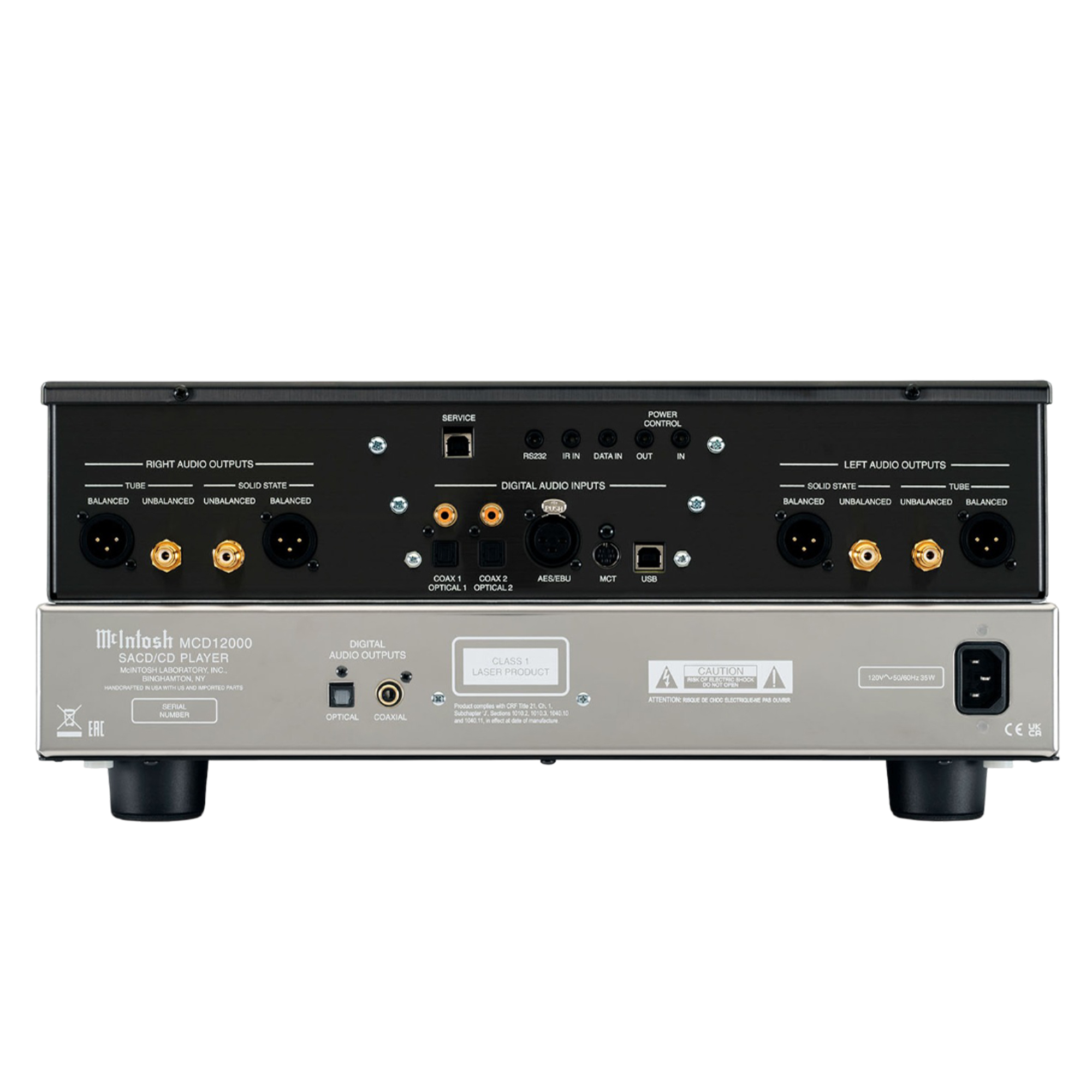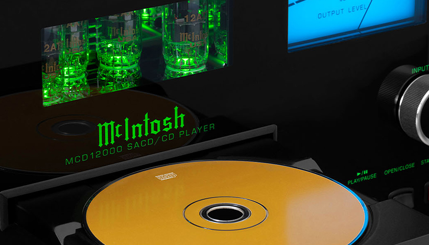 Помимо распространенных SACD и CD, MCD12000 может воспроизводить музыку с созданных пользователем CD или DVD Data Discs. С этих дисков можно воспроизводить множество форматов файлов, включая AAC, AIFF, ALAC, DSD (до DSD128), FLAC, MP3, WAV и WMA. Двойной лазерный оптический пикап обеспечивает оптимальное считывание всех распространенных типов дисков. Дисковый транспорт оснащен прецизионным литым алюминиевым лотком, который обеспечивает плавную и бесшумную работу с дисками, а усовершенствованный цифровой сервопривод обеспечивает быструю, бесшумную и точную работу. Считывание аудиоданных с диска происходит с удвоенной скоростью, что обеспечивает лучшее отслеживание диска и обработку ошибок. Порты управления питанием и передачи данных обеспечивают беспрепятственную интеграцию с другими компонентами системы McIntosh.