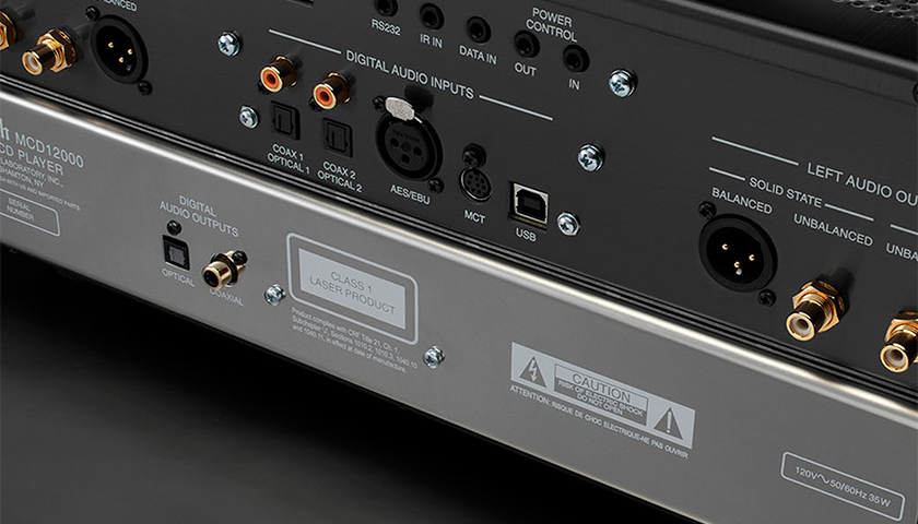 На MCD12000 имеется семь цифровых входов: два коаксиальных, два оптических, плюс один USB (тип B) для компьютерного аудио, один AES/EBU и один MCT-вход, который можно использовать с любым из уже имеющихся у вас MCT SACD/CD-транспортов. Коаксиальный и оптический входы поддерживают разрешение до 24 бит/192 кГц. Вход USB поддерживает до 32 бит/384 кГц, а также DSD512 и DXD384 кГц.