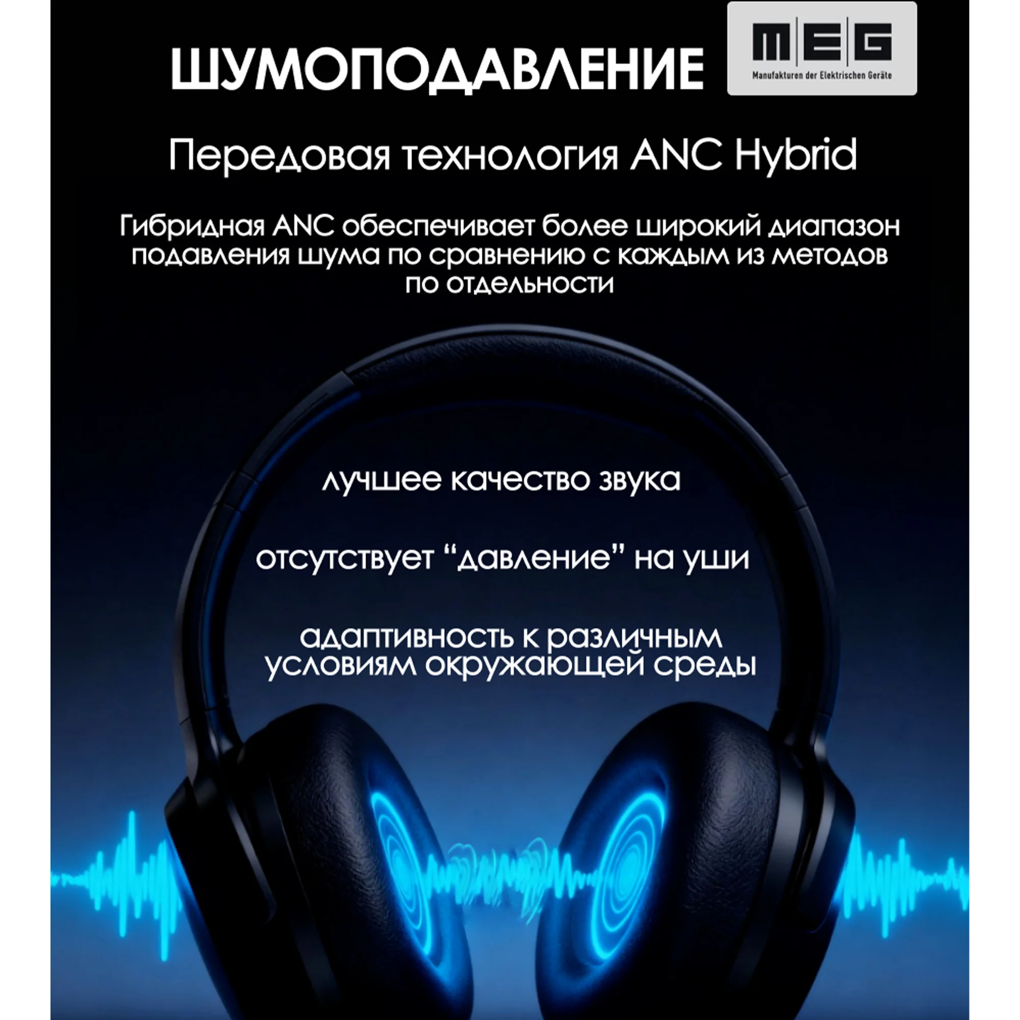 Откройте для себя мир звука с MEG HEA400BL Elysium — вашими новыми беспроводными наушниками, созданными для ценителей музыки. Эти большие беспроводные наушники серии ELYSIUM сочетают в себе превосходный дизайн и передовые технологии. Накладные беспроводные наушники MEG HEA400BL с мощным шумоподавлением ANC Hybrid (2 внешних + 2 внутренних микрофона) эффективно изолируют вас от внешних звуков. Большие беспроводные наушники с шумоподавлением — ваш идеальный спутник.