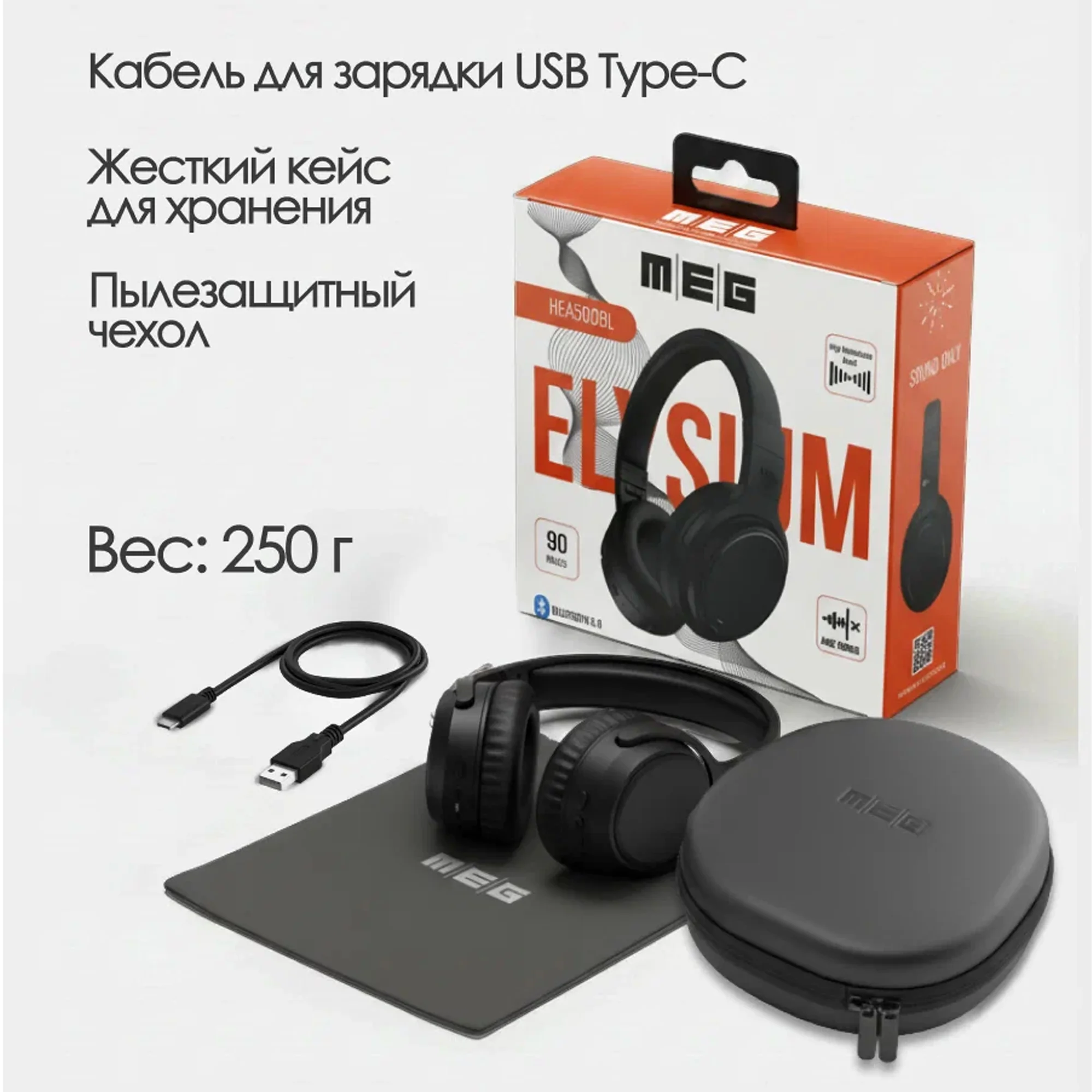 MEG HEA500BL Elysium - большие беспроводные накладные наушники с гибридным шумоподавлением, Bluetooth 6.0, временем работы 55/90 ч, USB-C, функцией прозрачности, многоточечным подключением — премиальные чёрные наушники для ПК и Android.