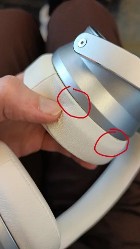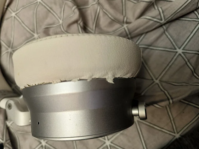 -Через примерно 2 недели использования на амбушюрах начали появляться трещины(фото 1-2). На моих предыдущих наушниках такая проблема возникла только через 2 года практически беспрерывного использования. А самое главное, на старых sony wh-xb900n заменить амбушюры не составляло проблемы. Для этой же модели замены в свободной продаже нет. Второе фото было сделано сегодня, спустя почти 6 месяцев использования. Посмотрите, насколько сильно повредилась эко-кожа;