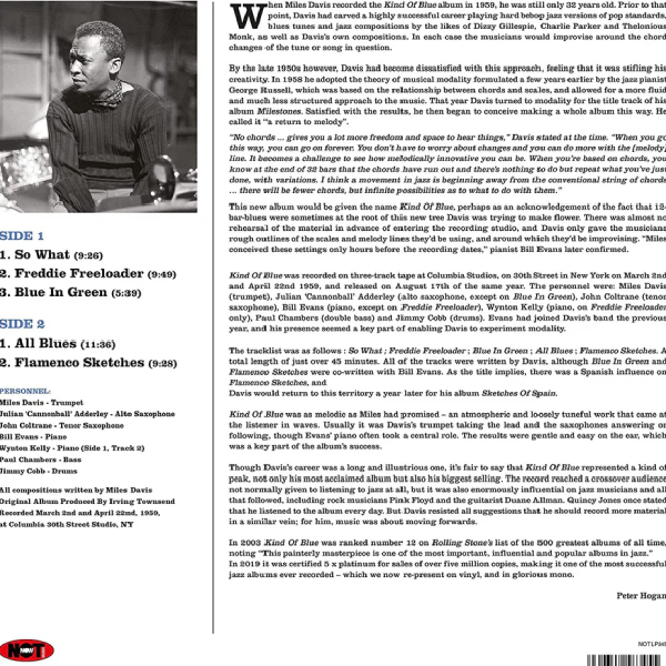 Эта пластинка стала революционной: она определила на долгие годы звучание модального джаза. Здесь нет суеты, нет лишних нот - только пространство, воздух, мягкий свет, тихая грусть, мечты, задумчивость... «Kind of Blue» - это музыка, которая не просто звучит, а живёт внутри слушателя. Даже спустя десятилетия она остаётся эталоном, к которому возвращаются вновь и вновь.
