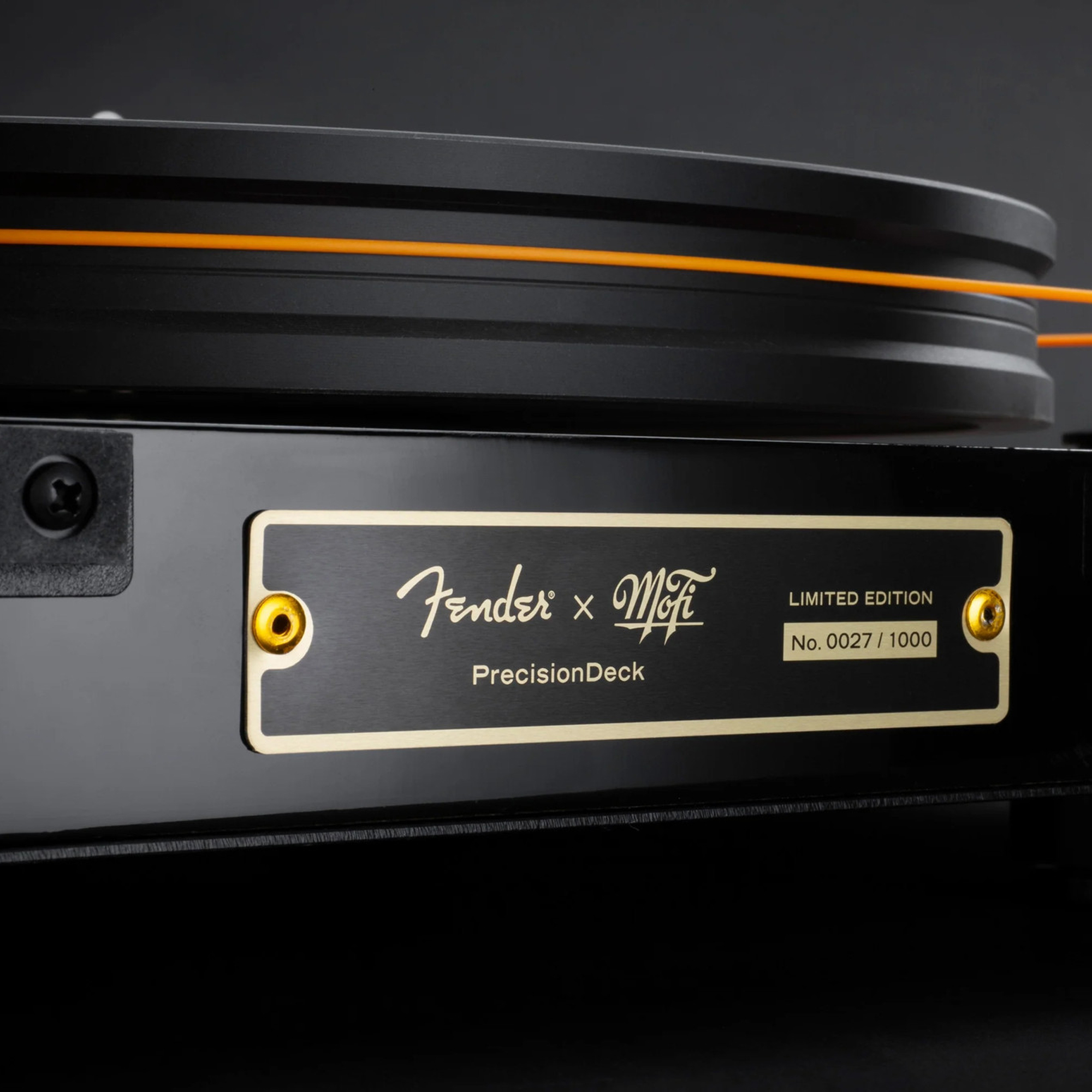 Коллекционная модель Precision Deck, выпущенная ограниченным тиражом в 1000 экземпляров, имеет индивидуальный номер и маркировку, а также именную табличку, похожую на металлические таблички с серийными номерами на гитарах Fender. Эта практичная и привлекательная деталь — ещё один способ связать проигрыватель с богатой историей Fender и Mobile Fidelity.