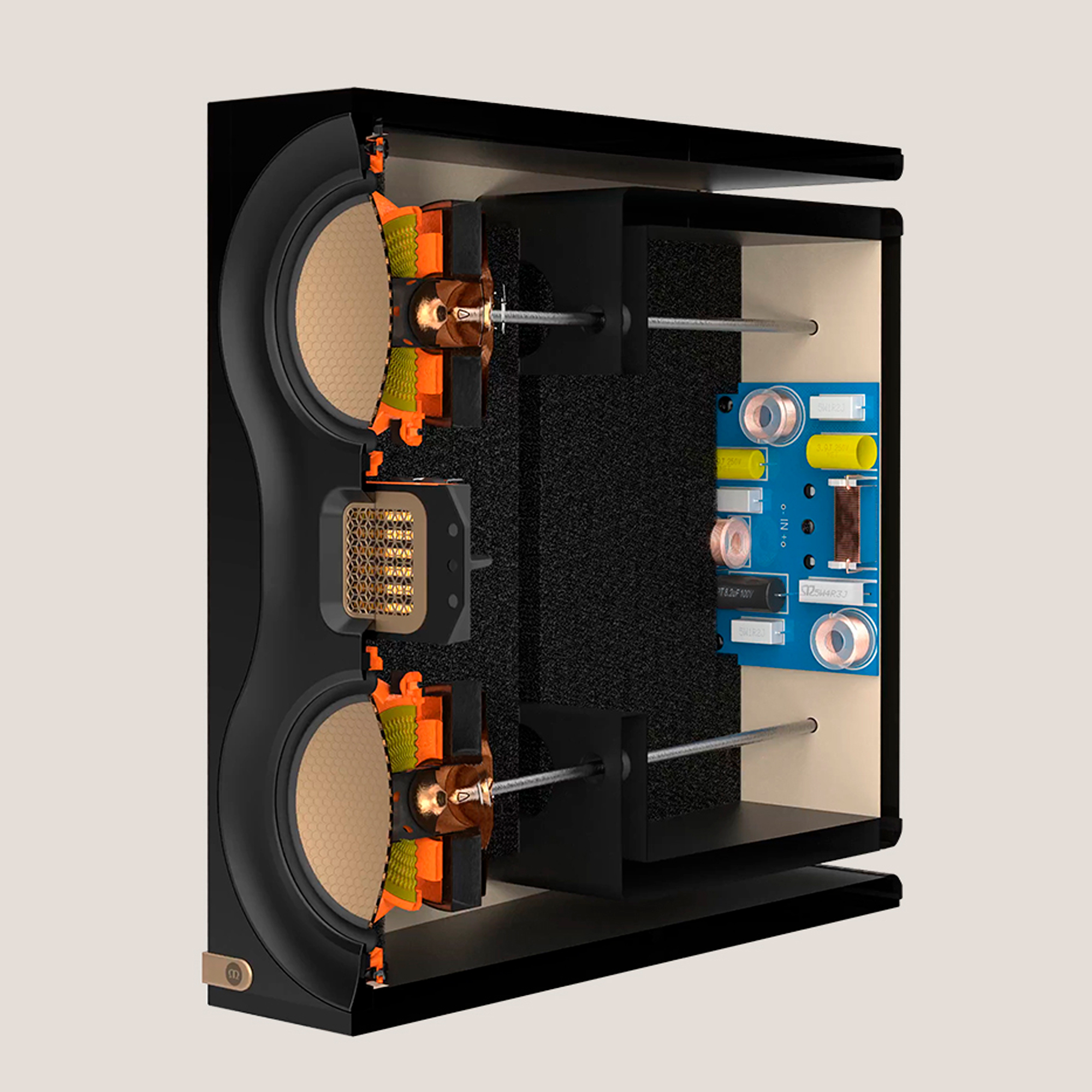 Ленточный твитер нового поколения MPD III установлен между басовиками. Он отличается расширенным частотным диапазоном для прозрачного и детализированного звучания. Все три динамика смонтированы в едином блоке, механически изолированном от фронтальной панели с целью гашения вибраций и устранения искажений. Его фиксация выполнена с помощью металлических штырей-стяжек, закрепленных на тыльной стороне корпуса.