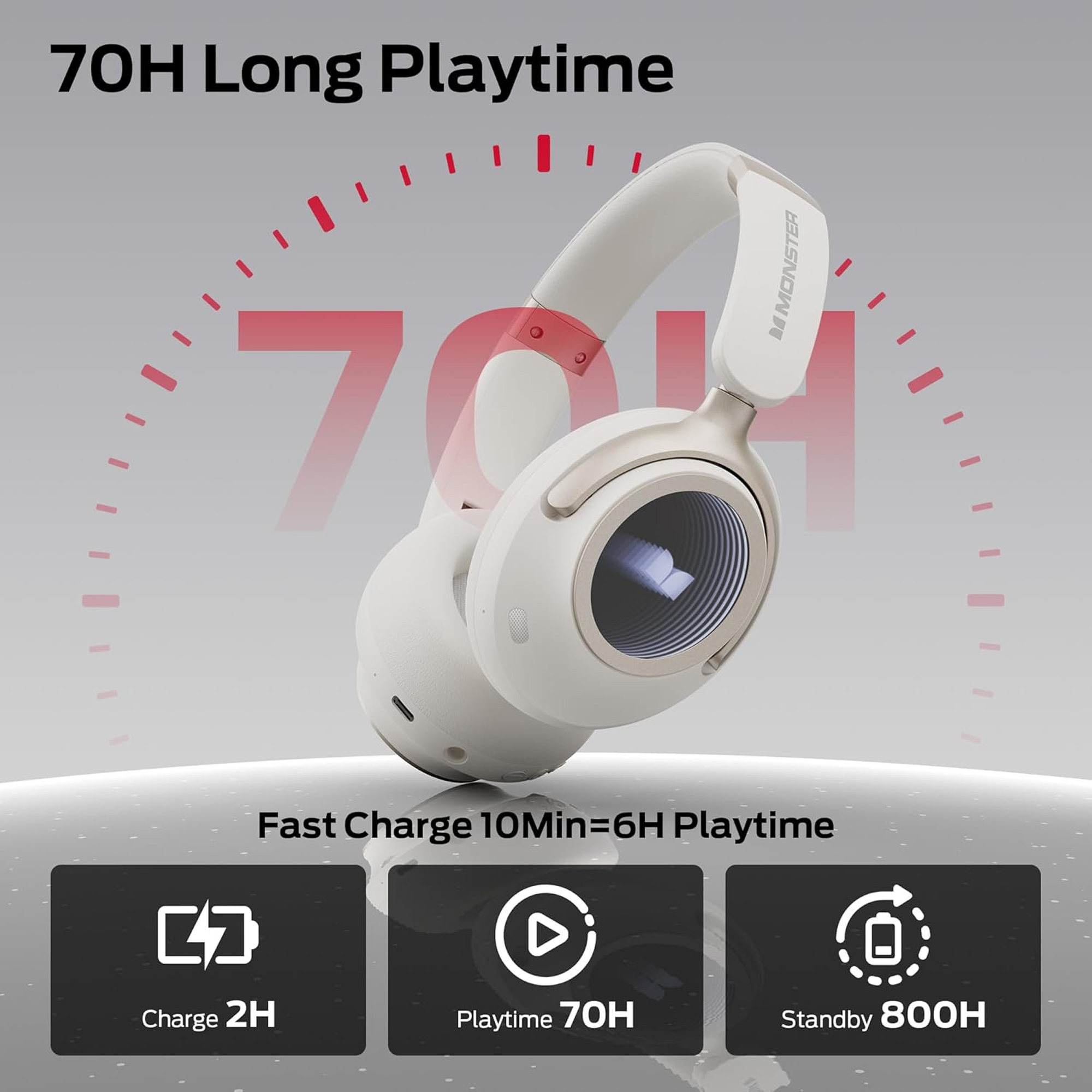 Полностью заряженные наушники обеспечивают до 70 часов воспроизведения (при выключенном активном шумоподавлении) или 50 часов (при включенном активном шумоподавлении). Быстрая зарядка за 10 минут обеспечивает приблизительно 5 часов воспроизведения.