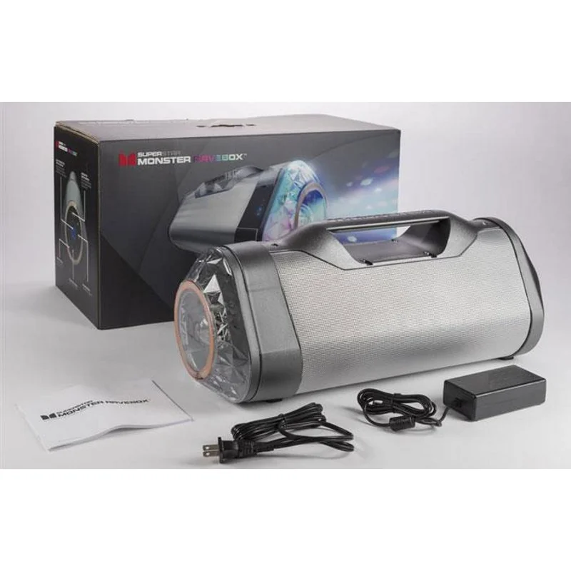 Monster RaveBox – это классический Бумбокс, шагнувший на совершенно новый уровень. Современный дизайн, передовые технологии беспроводной связи и эпически чистый звук Monster®. Монстр RAVEBOX позволяет сделать праздник дома с глубокими мощными басами и ослепительными цветами светового шоу, которые пульсируют синхронно с музыкой.