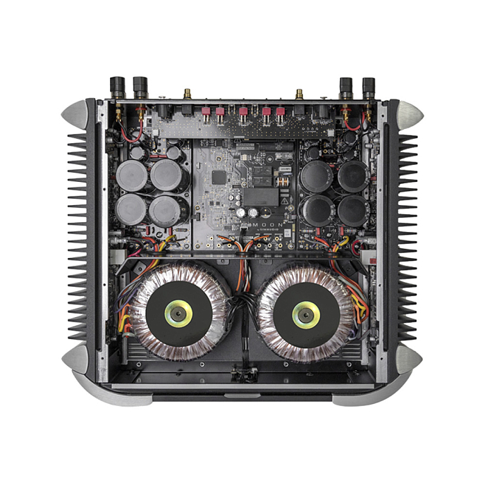 В блоке питания 761 установлены два индивидуально изготовленных малошумящих трансформатора мощностью 700 ВА с емкостями 152000 мкФ и полупроводниками высочайшего качества, что гарантирует стабильную работу. Этот усилитель по схеме двойное моно выдает 200 Вт на канал на нагрузку 8 Ом в стерео, удваивает мощность на нагрузку 4 Ом, а также имеет переключатель для мостового подключения усилителей и выдает 600 Вт на нагрузку 8 Ом в качестве моноблока. Усилитель MDCA (MOON Distortion- Cancelling Amplifier) основан на философии дизайна, исключающей глобальную обратную связь, с новой схемой, которая снижает искажения и шум до ранее недостижимых уровней.
