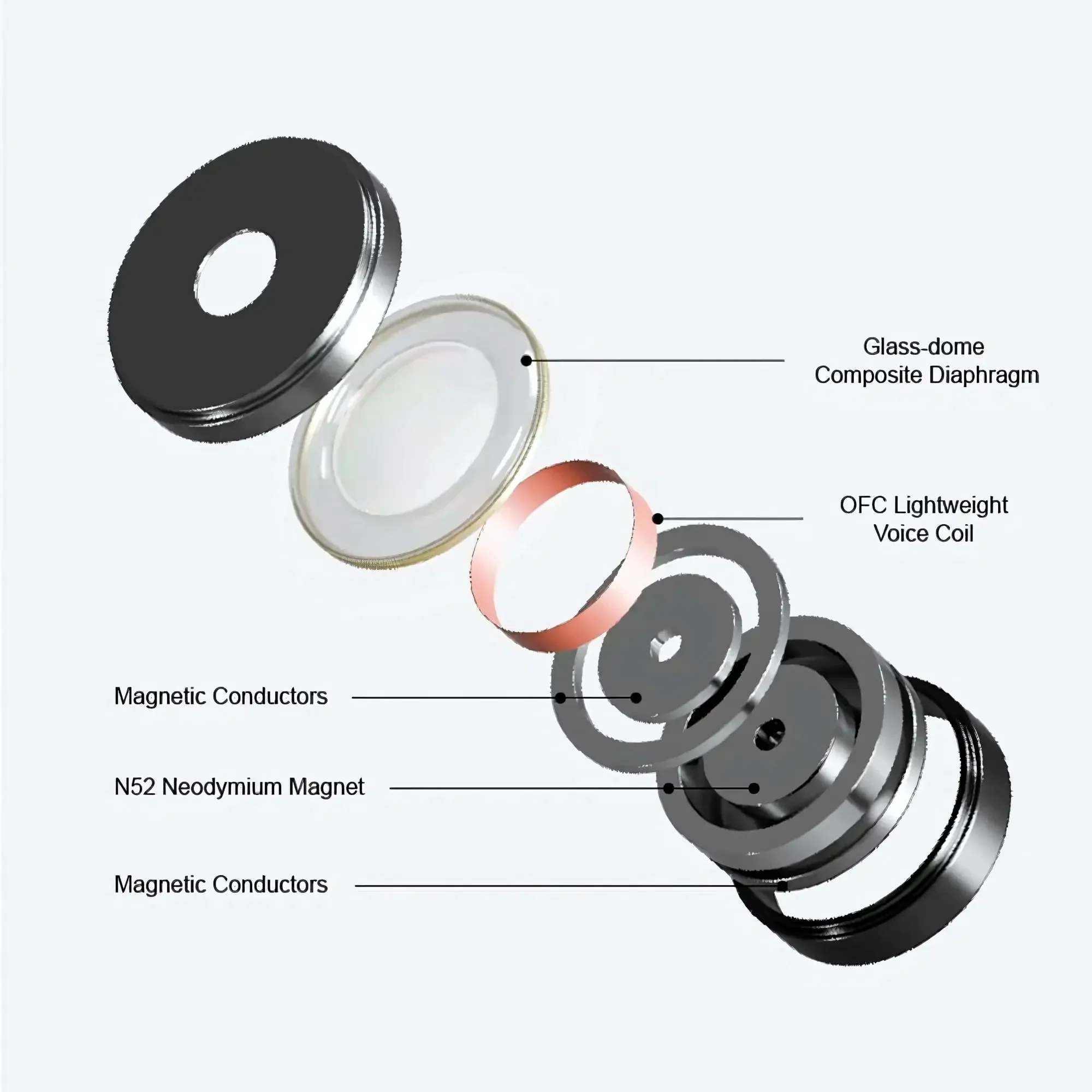 СЧ/ВЧ динамик оснащён ультратонкой диафрагмой из стеклянного купола, обладающей высокой жёсткостью и низким уровнем искажений. За бас отвечают два 10-мм драйвера с гибкими бумажными диафрагмами, расположенные в горизонтальной оппозиции.