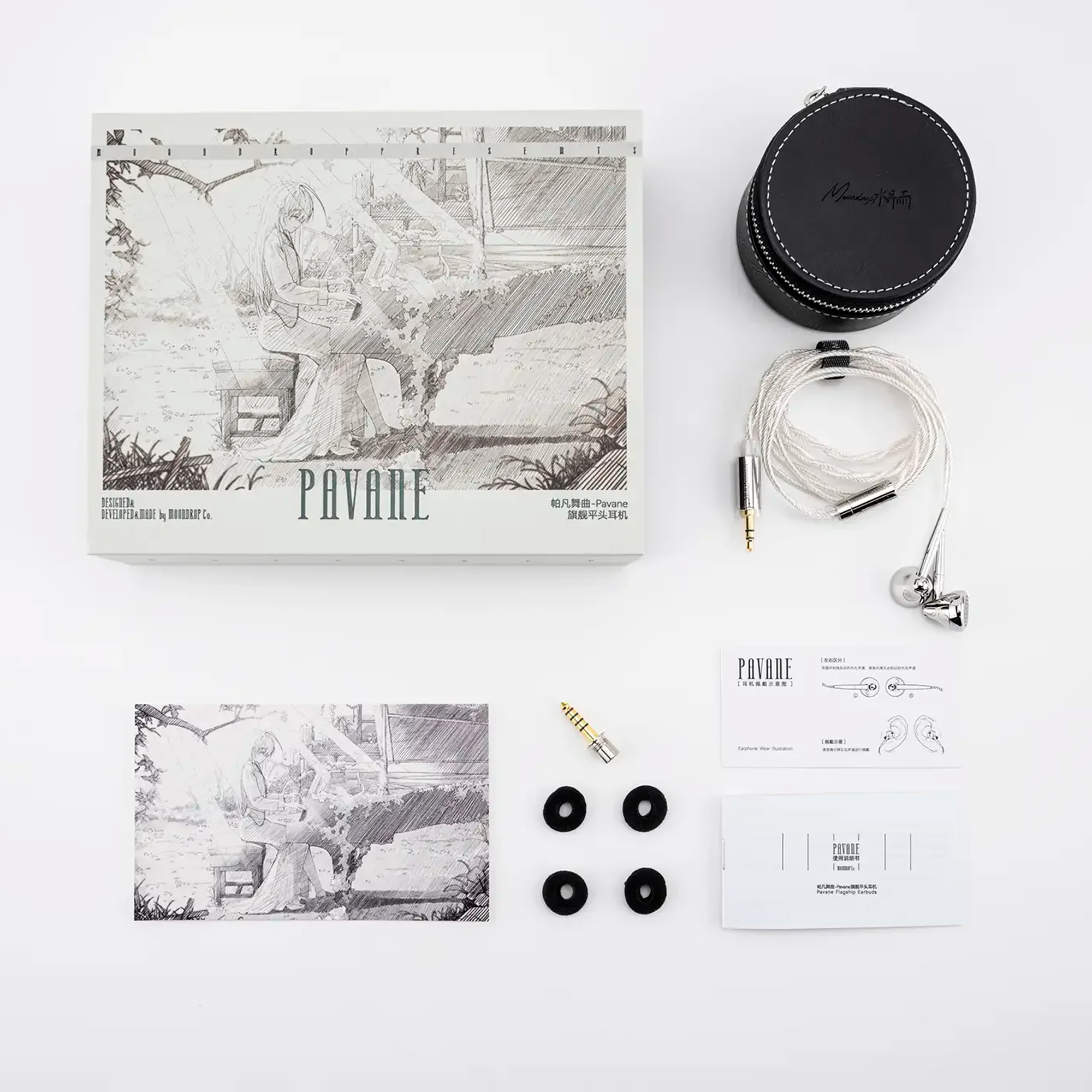 Корпус PAVANE изготавливается из нержавеющей стали методом высокоточной обработки, сочетающей токарные и фрезерные операции. Несъемный кабель выполнен из однокристальной меди с серебряным покрытием в структуре Litz, комплектуется сменными разъемами 3.5 мм (стандартный) и 4.4 мм (балансный).